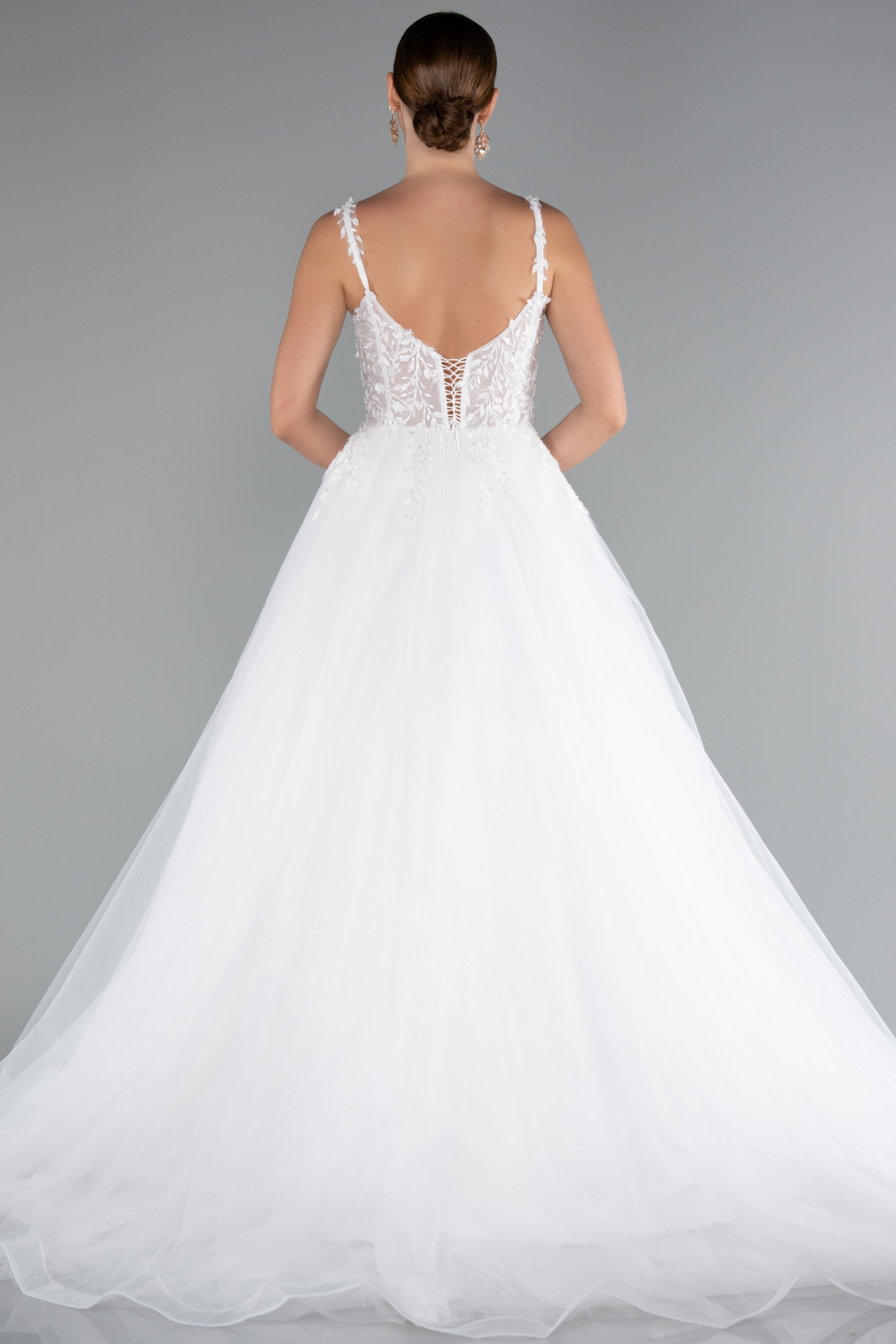 Ekru Askılı Güpür İşlemeli Uzun Prenses Model Gelinlik ABG136
