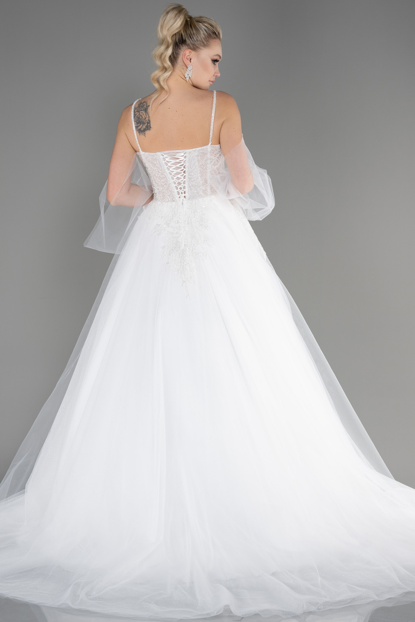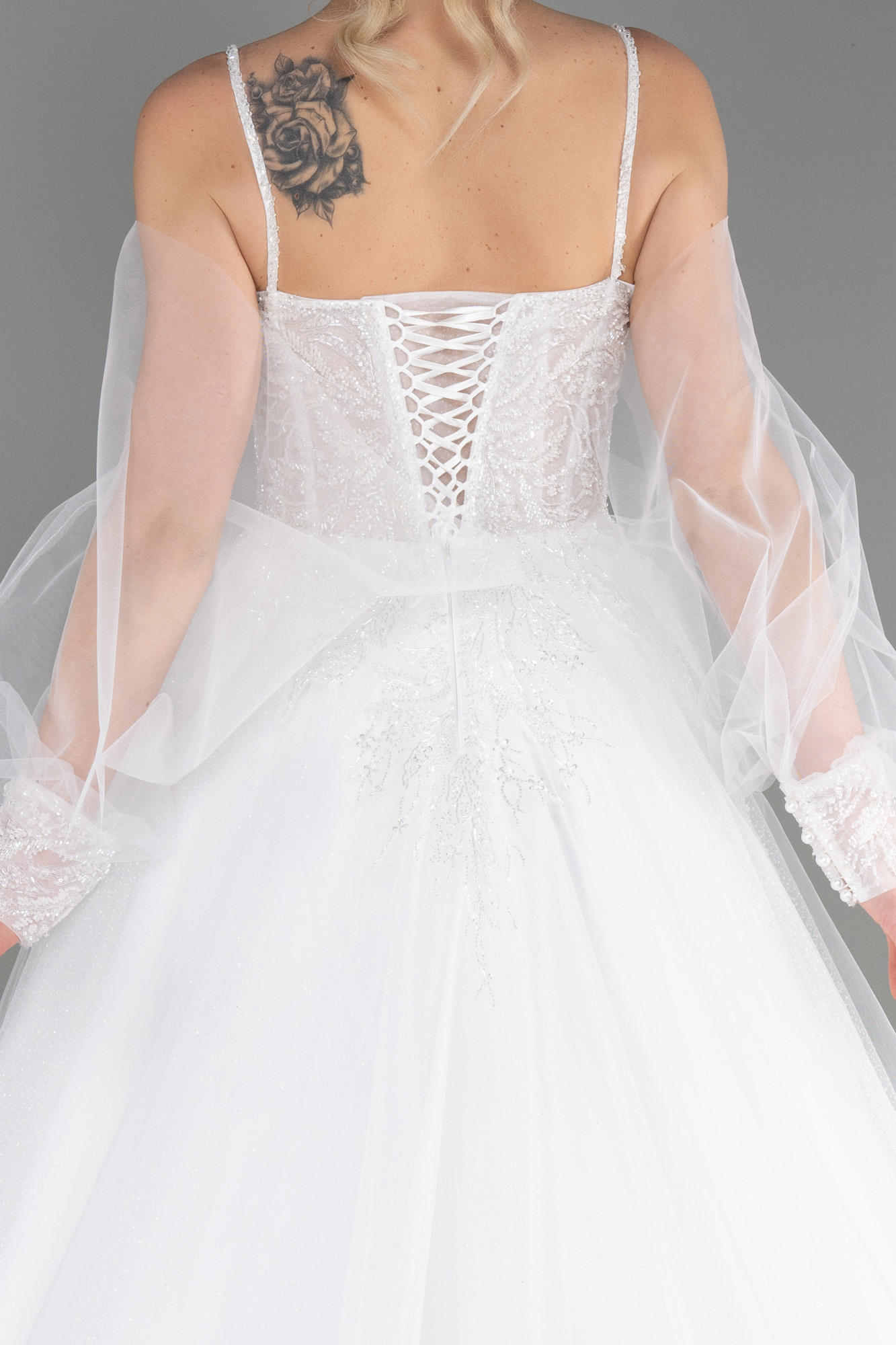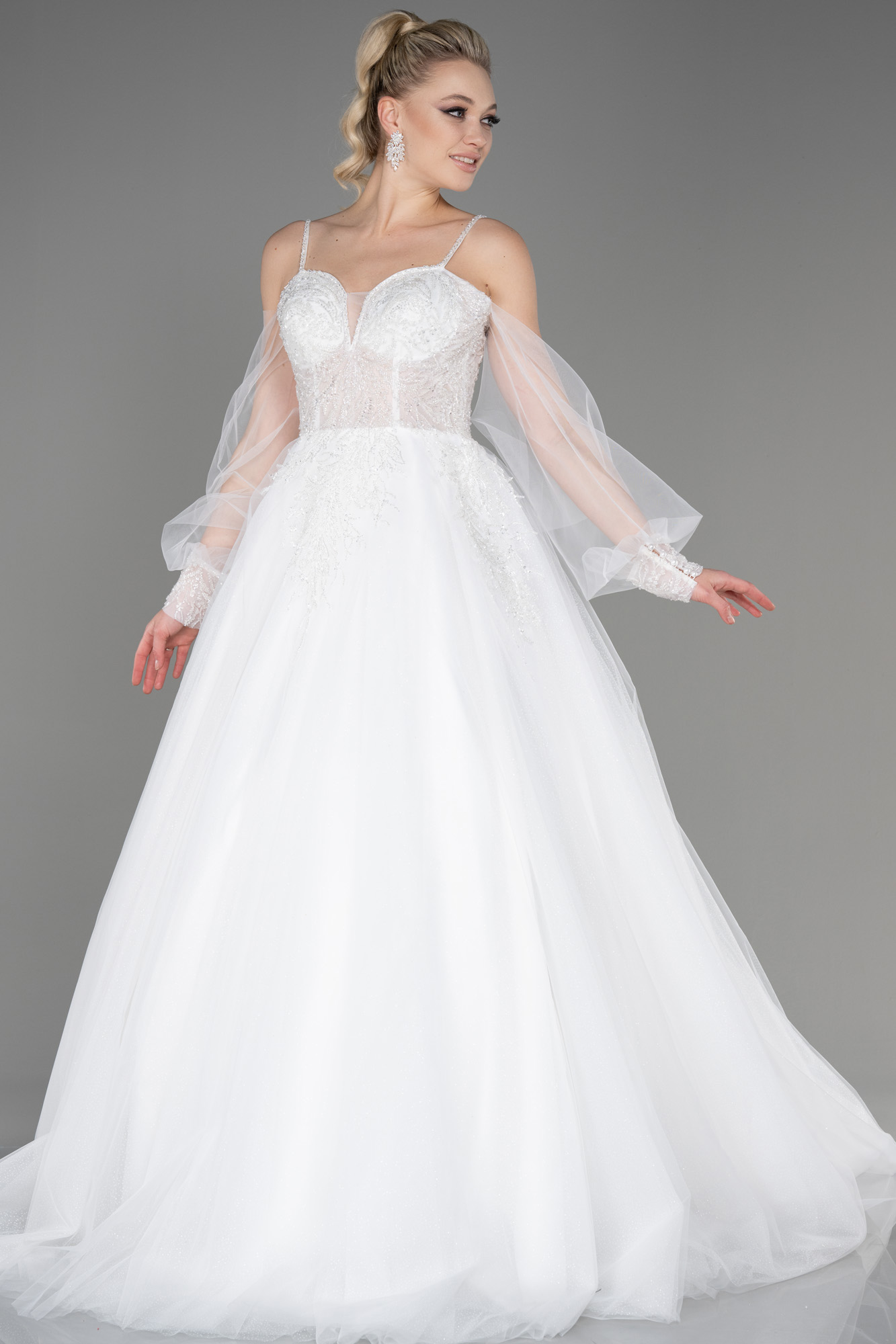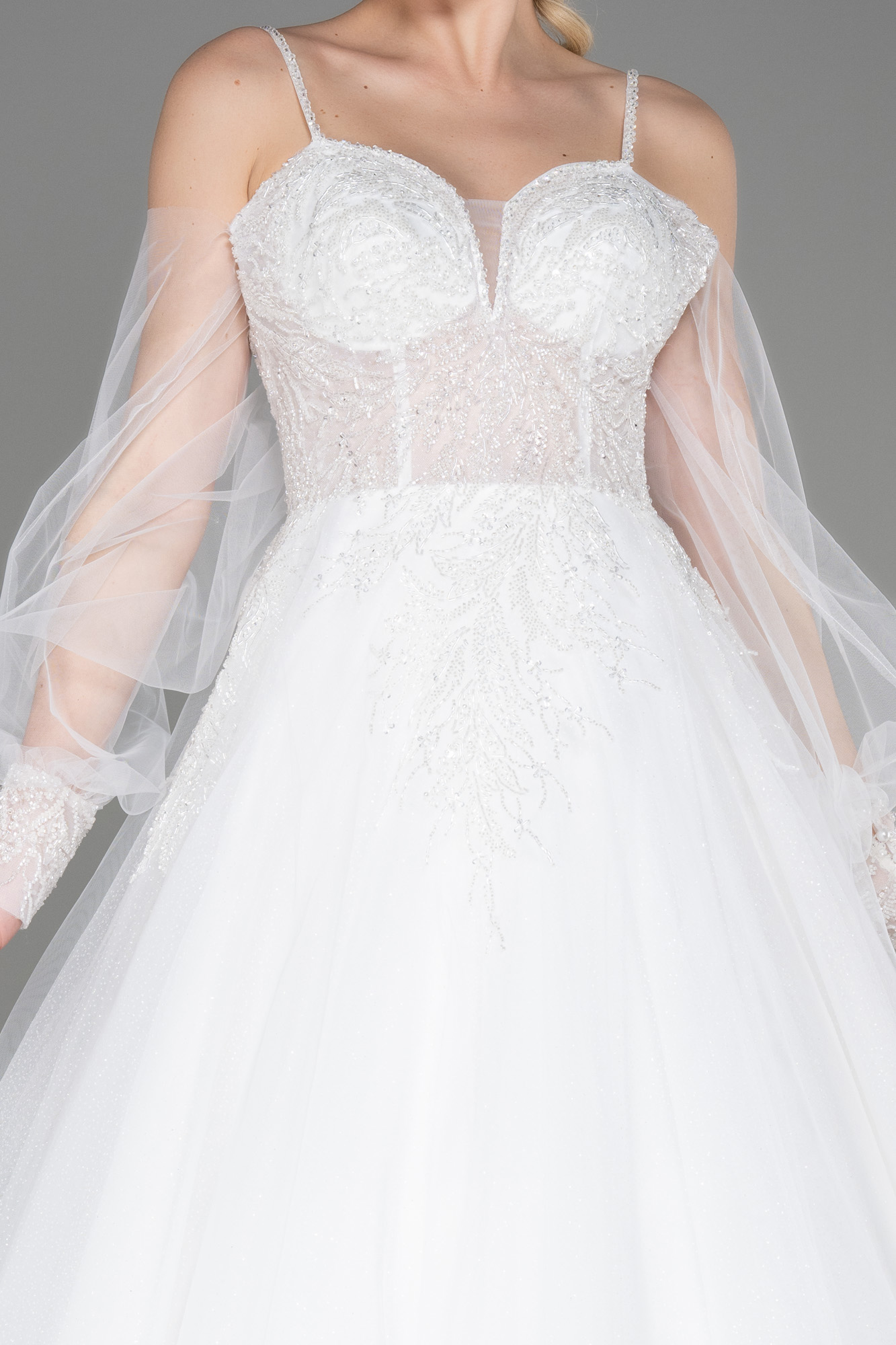 Ekru Omuz Dekolteli Uzun Kol İşlemeli Uzun Gelinlik ABG117