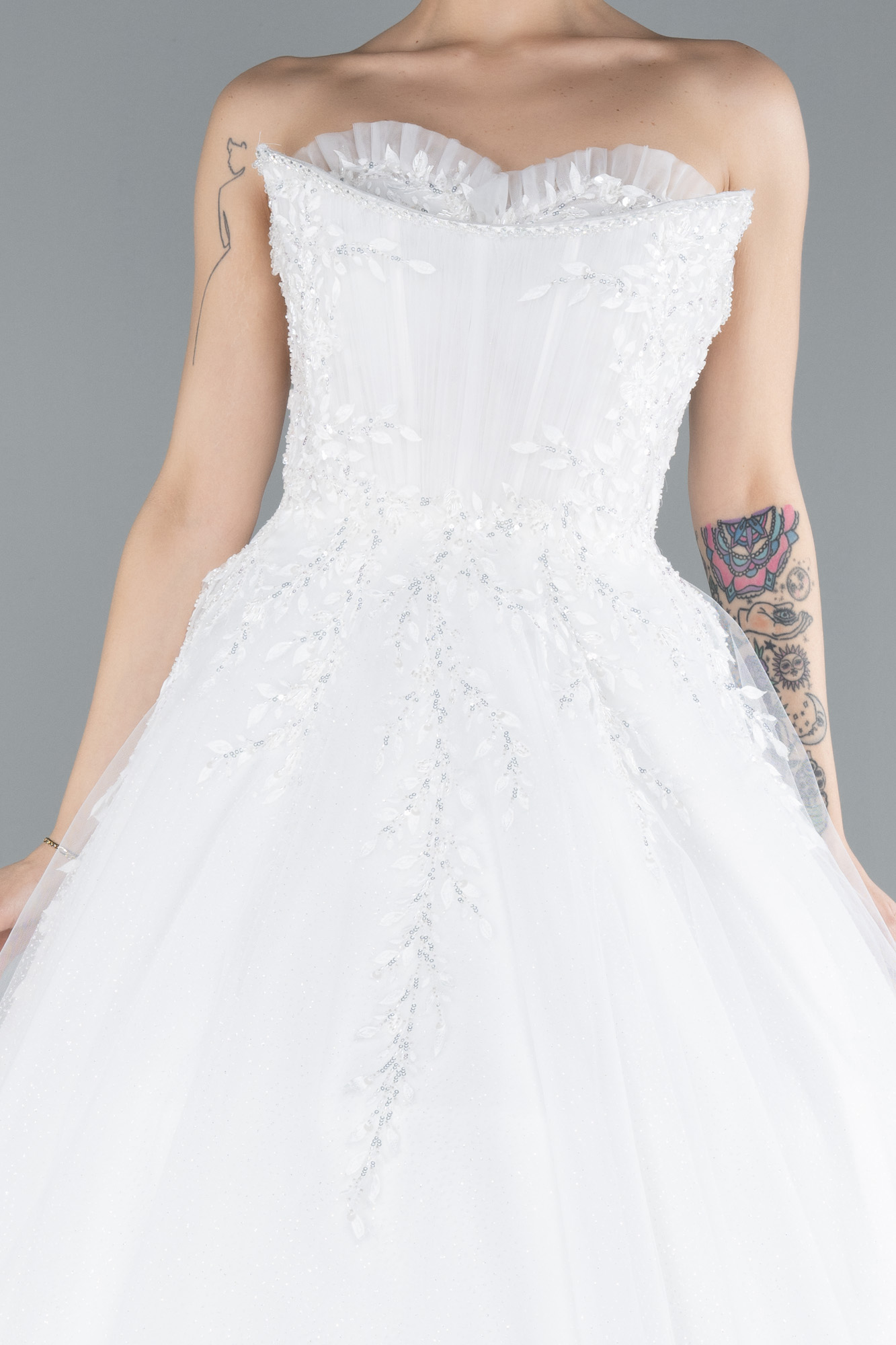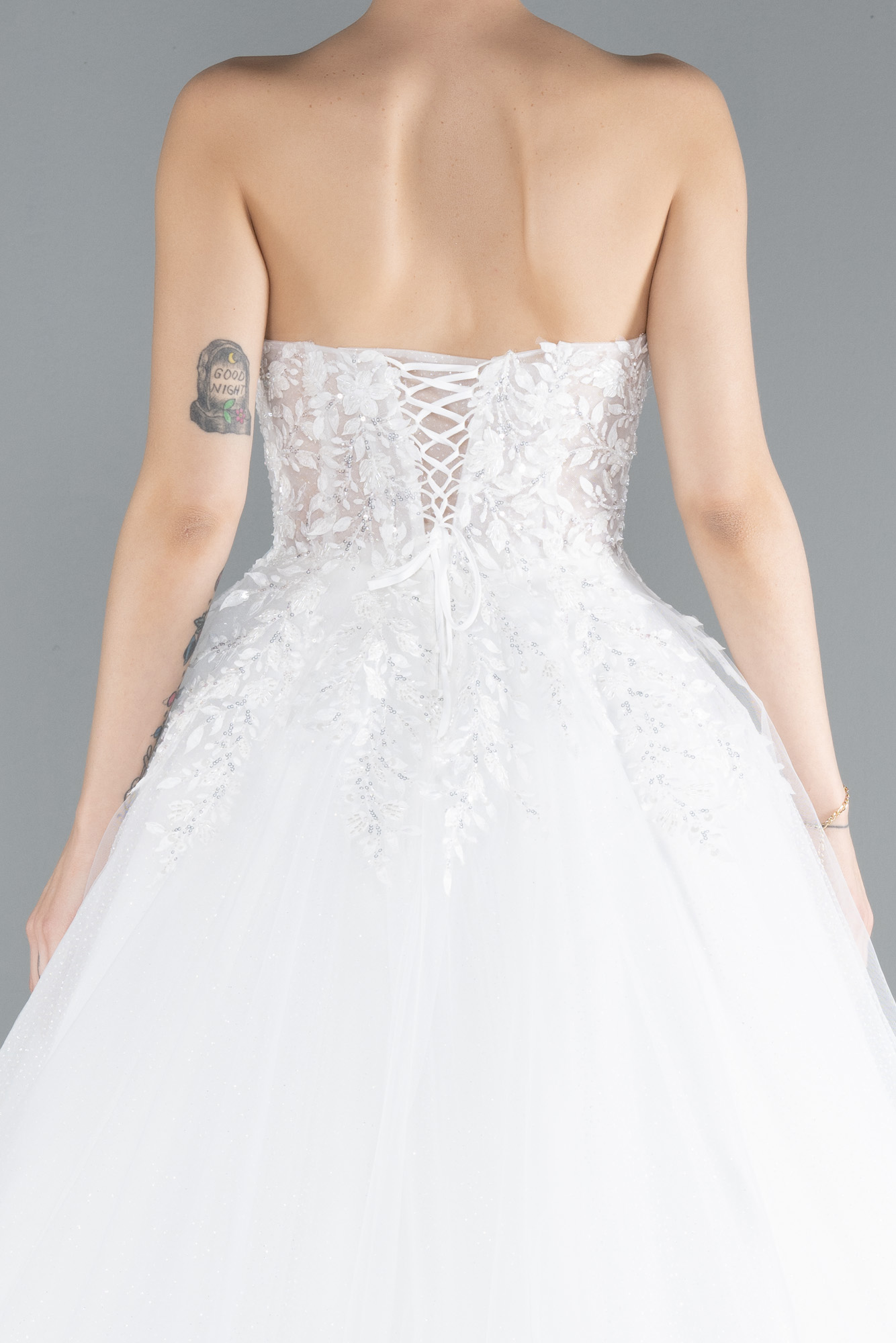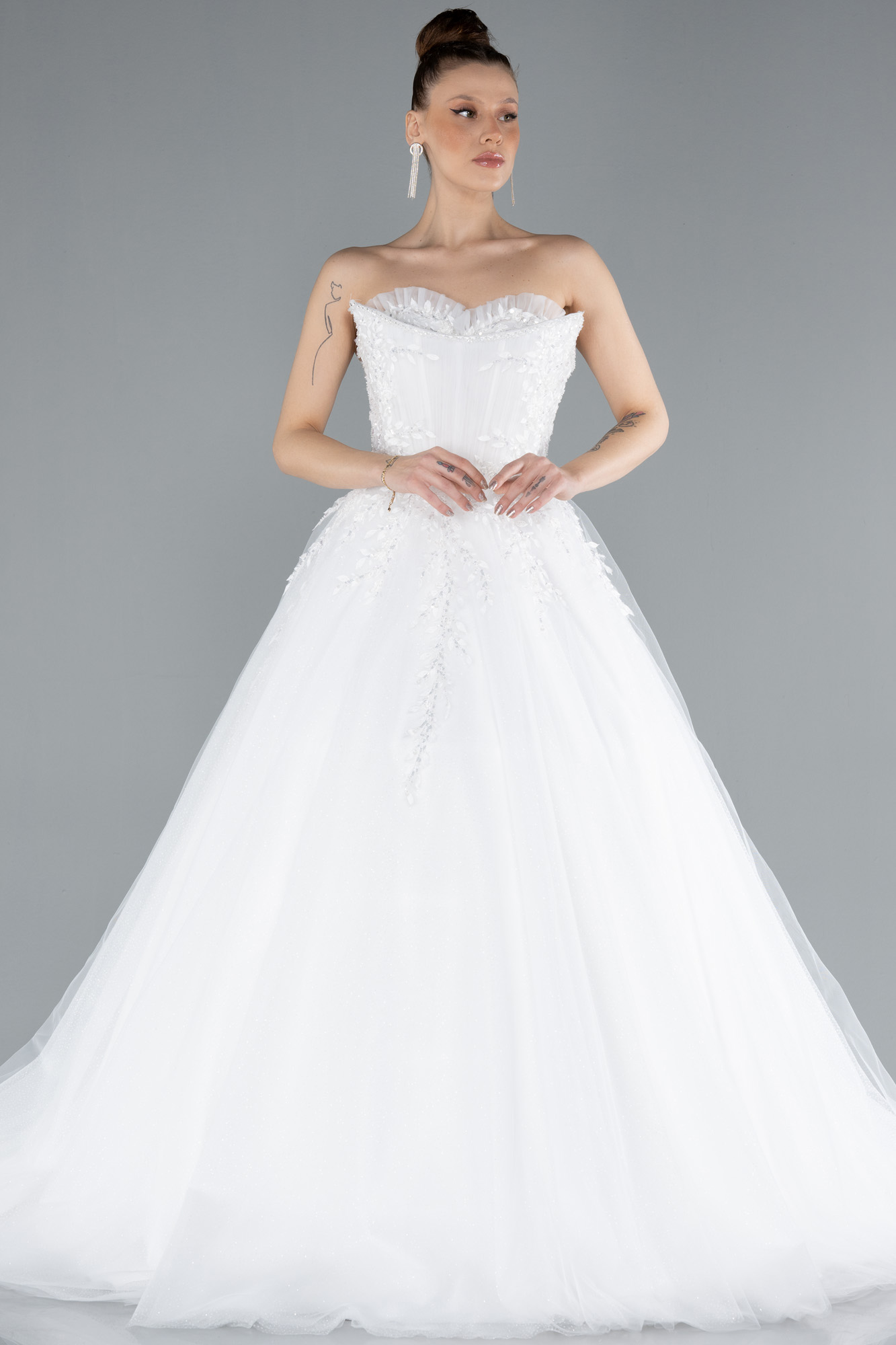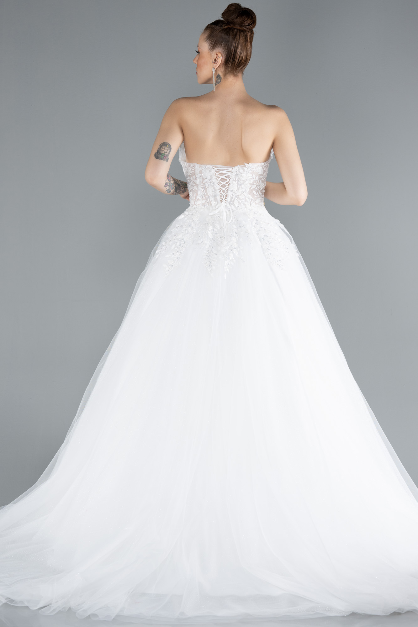 Ekru Straplez Güpür İşlemeli Uzun Büyük Beden Gelinlik ABG122