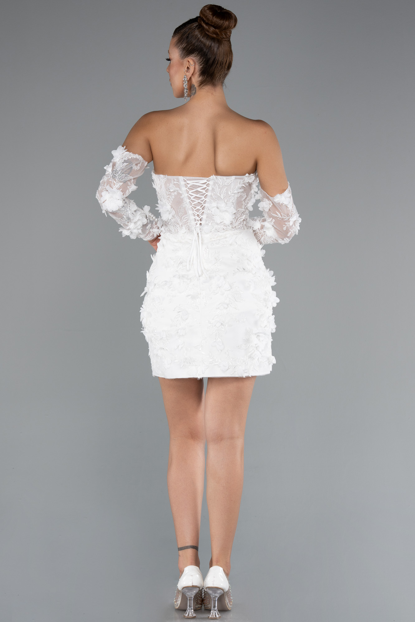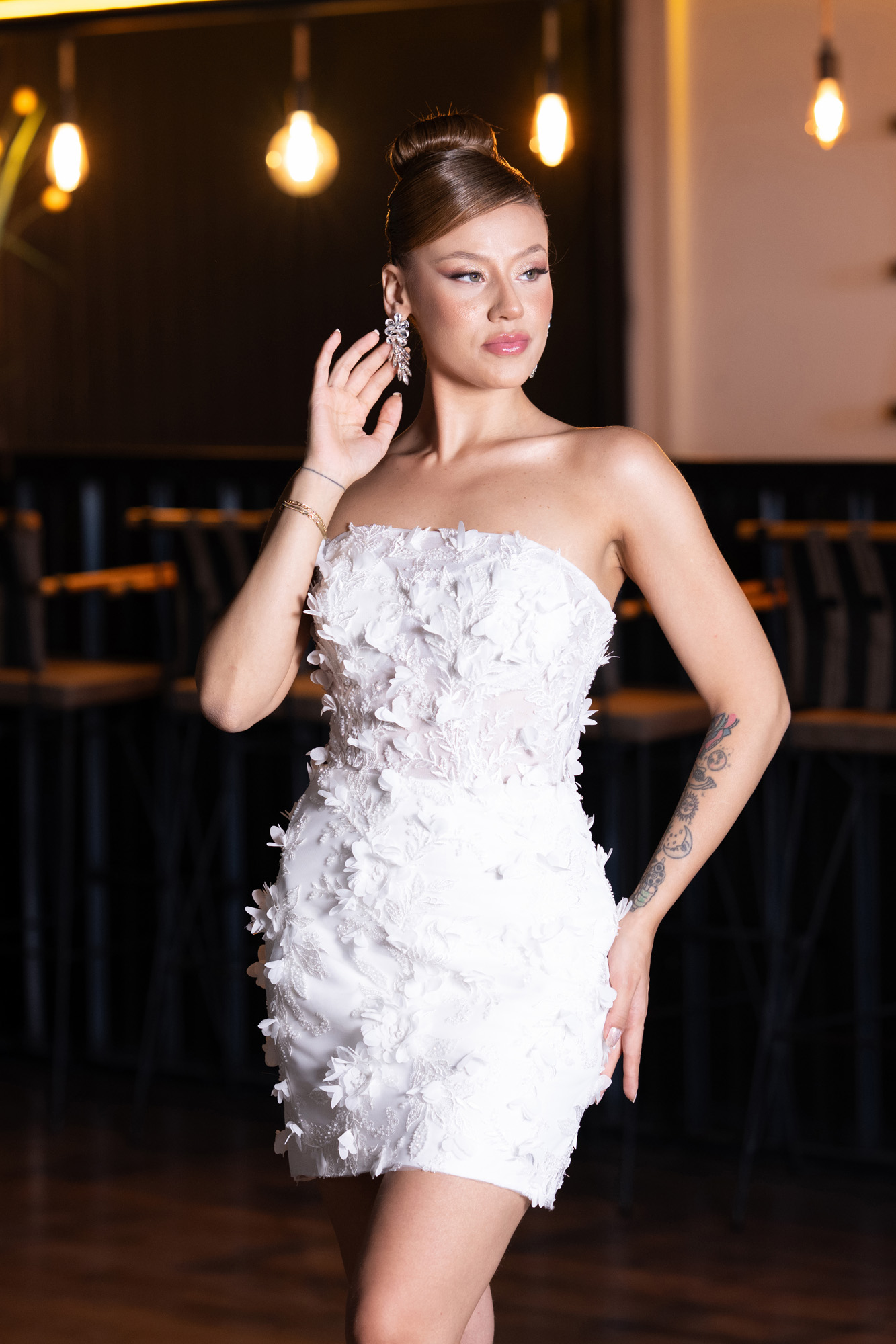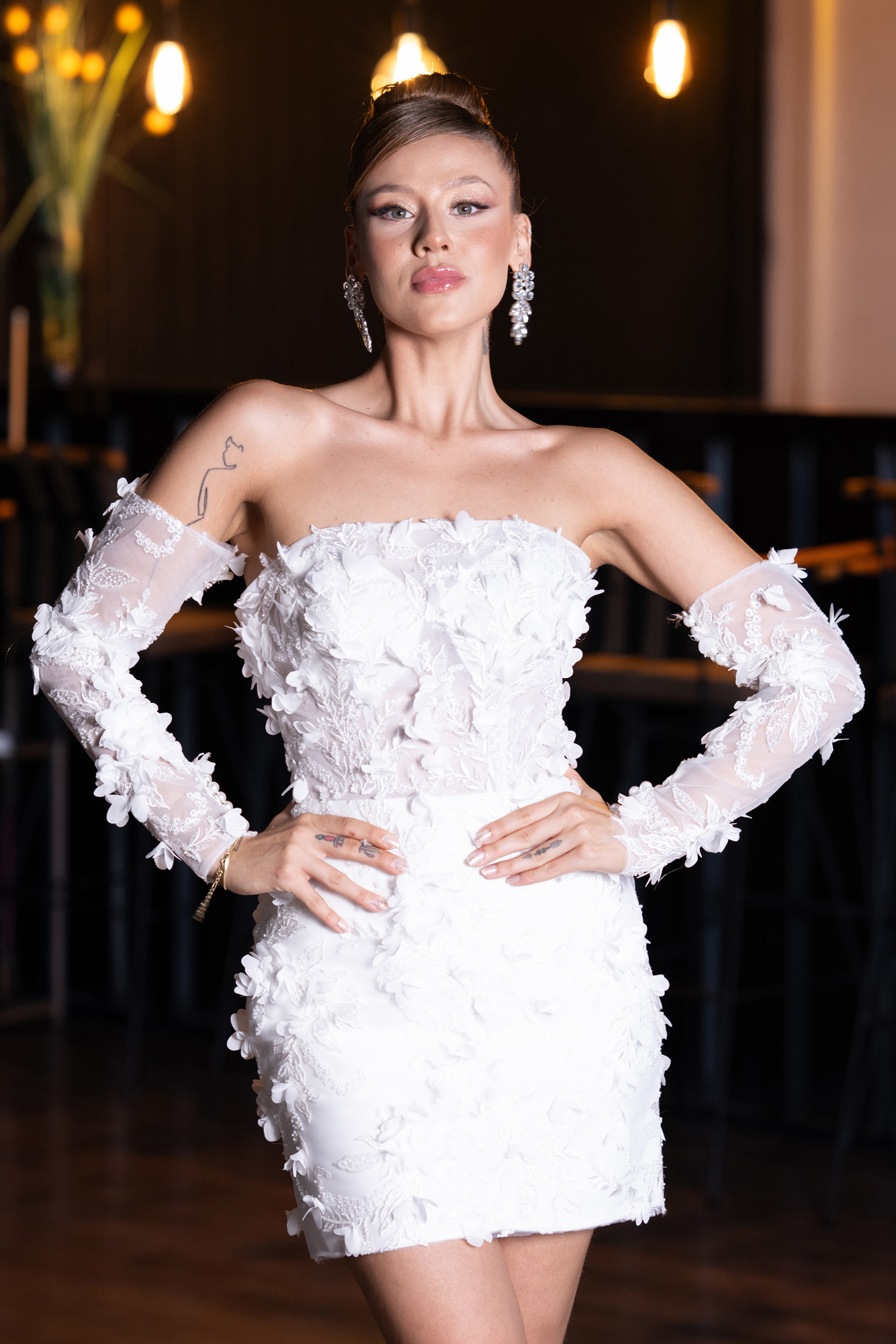 . Straplez kısa gelinlik, üç boyutlu çiçek aplikeleriyle romantik bir hava sunar. Transparan tül yapısı ve çıkarılabilir kollarıyla hem klasik hem modern bir stilin öncüsü.