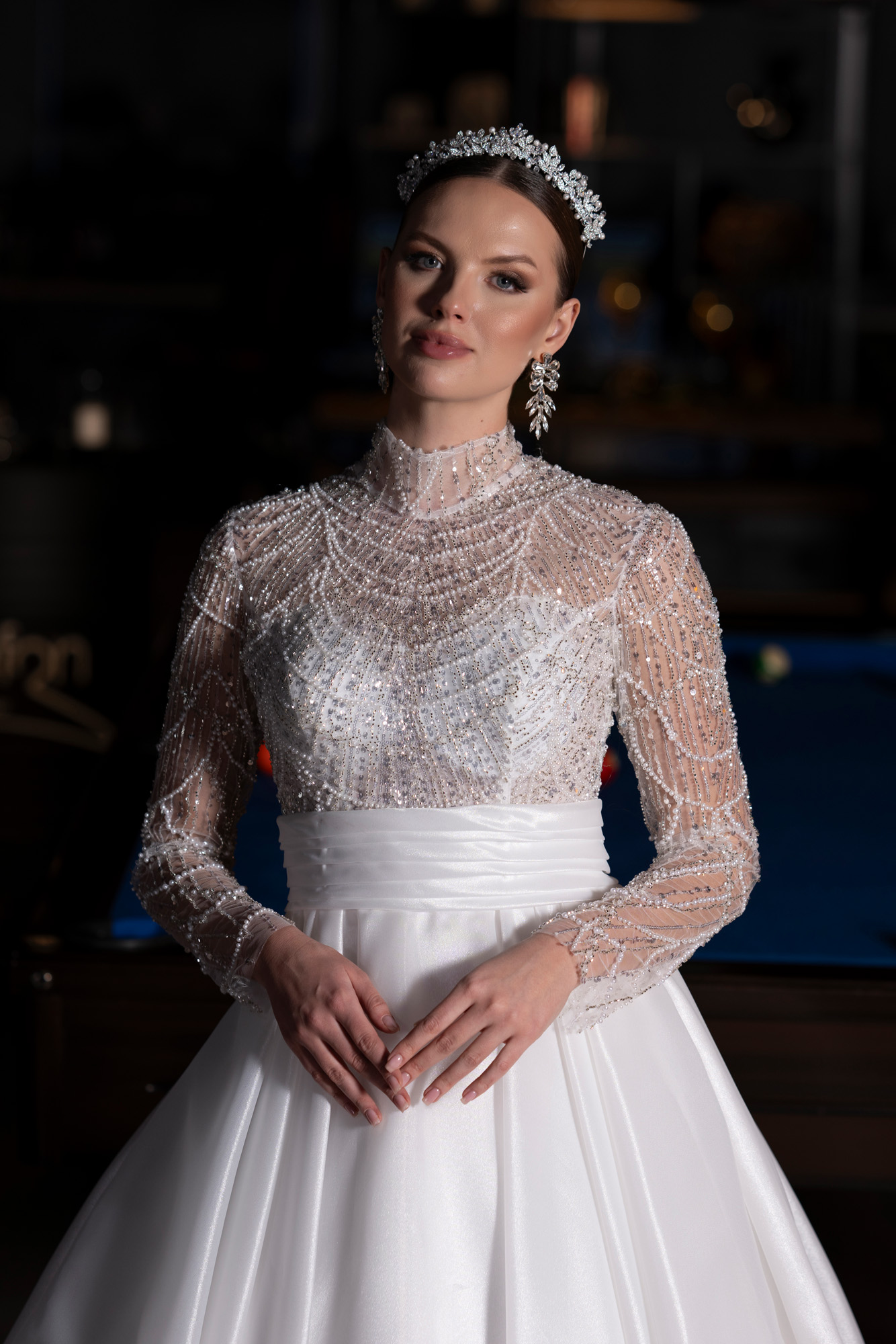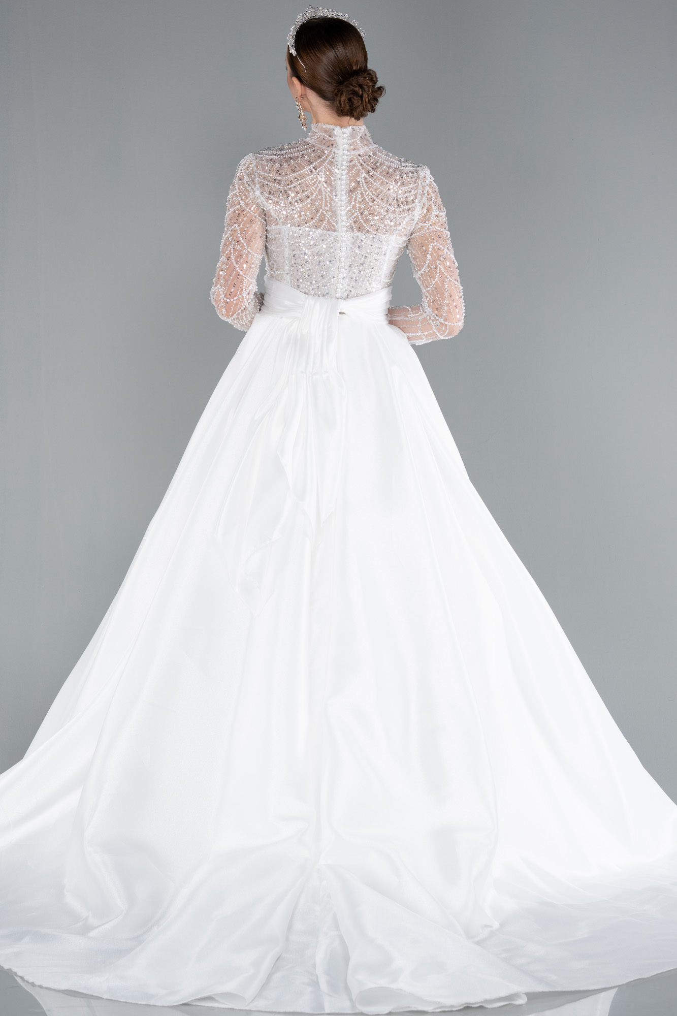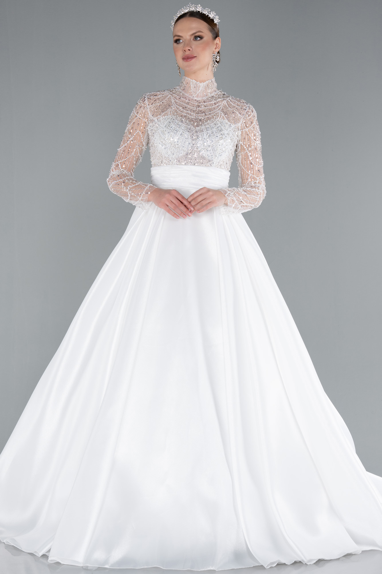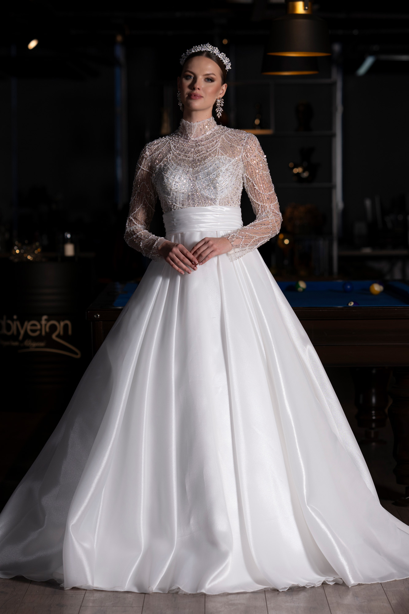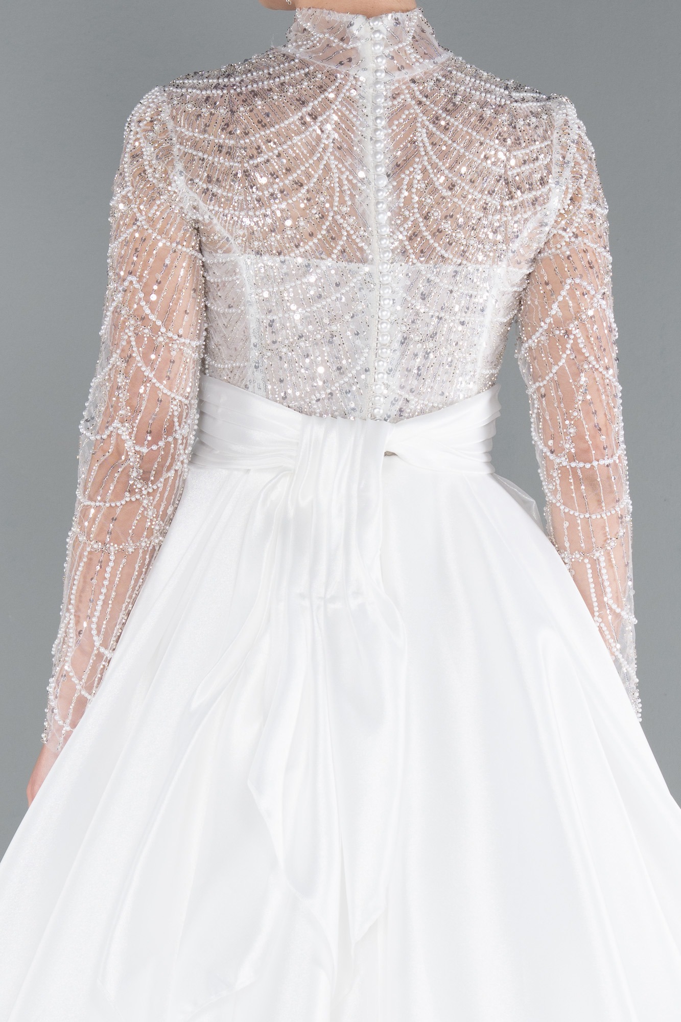 Ekru Taş İşlemeli Uzun Kol Saten Gelinlik ABG032