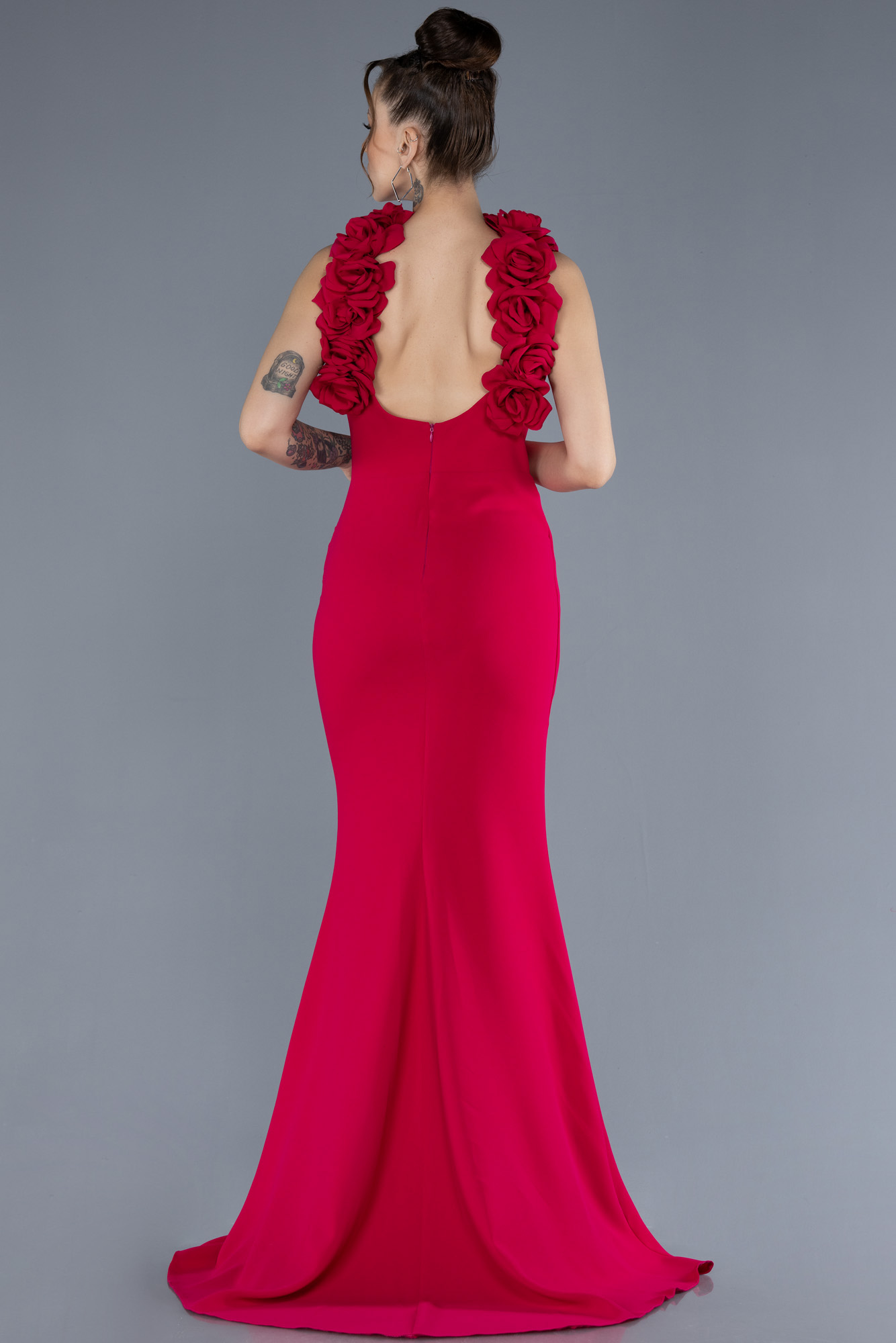Fuşya Güllü Halter Yaka Bacak Dekolteli Uzun Abiye ABU4610