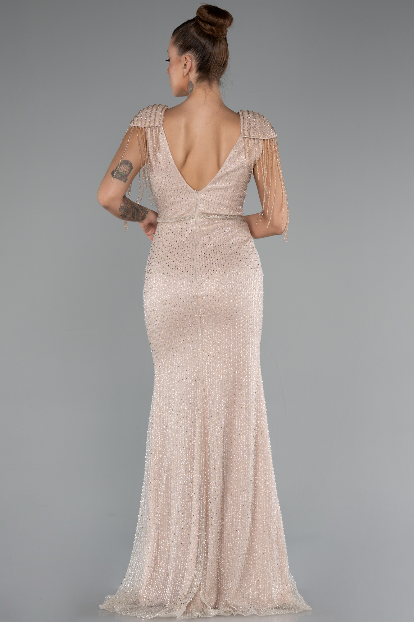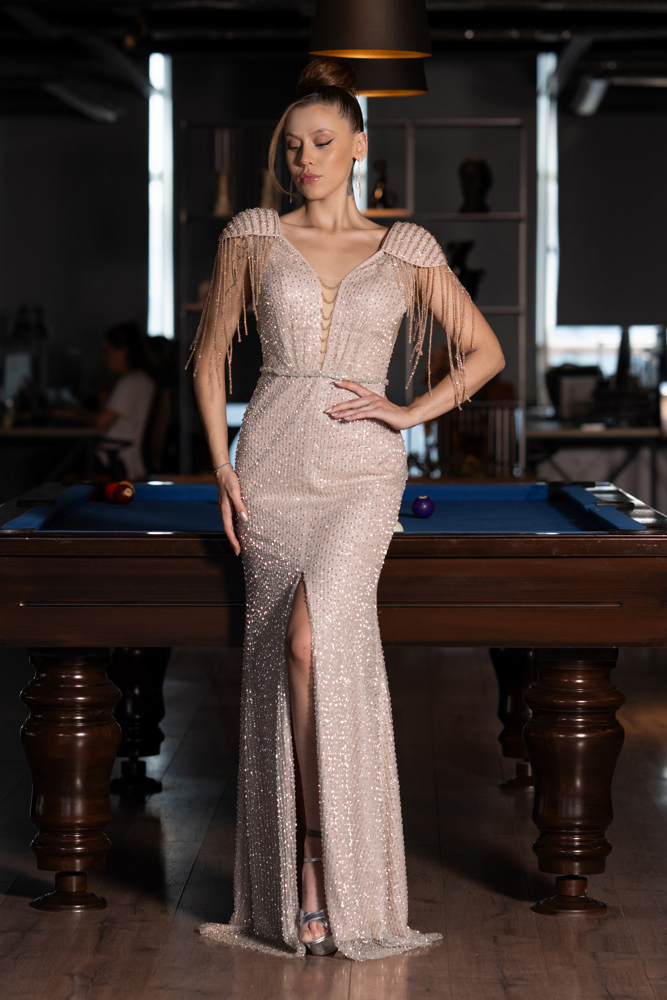 Taşlı kumaşıyla baştan sona ışıltı sunan özel tasarım uzun abiye, v yaka kesimi ve bacak dekoltesiyle zarif bir duruş sergiler. Vücuda oturan formu feminen hatları öne çıkarırken, omuzlardaki özel boncuk püsküller ve zincir detaylar modele güçlü bir siluet kazandırır. Kolsuz yapısı sayesinde modern ve şık bir görünüm sunan bu model, nişan abiyesi, gala gecesi veya özel davetlerde iddialı bir stil arayanlar için göz alıcı bir alternatif.