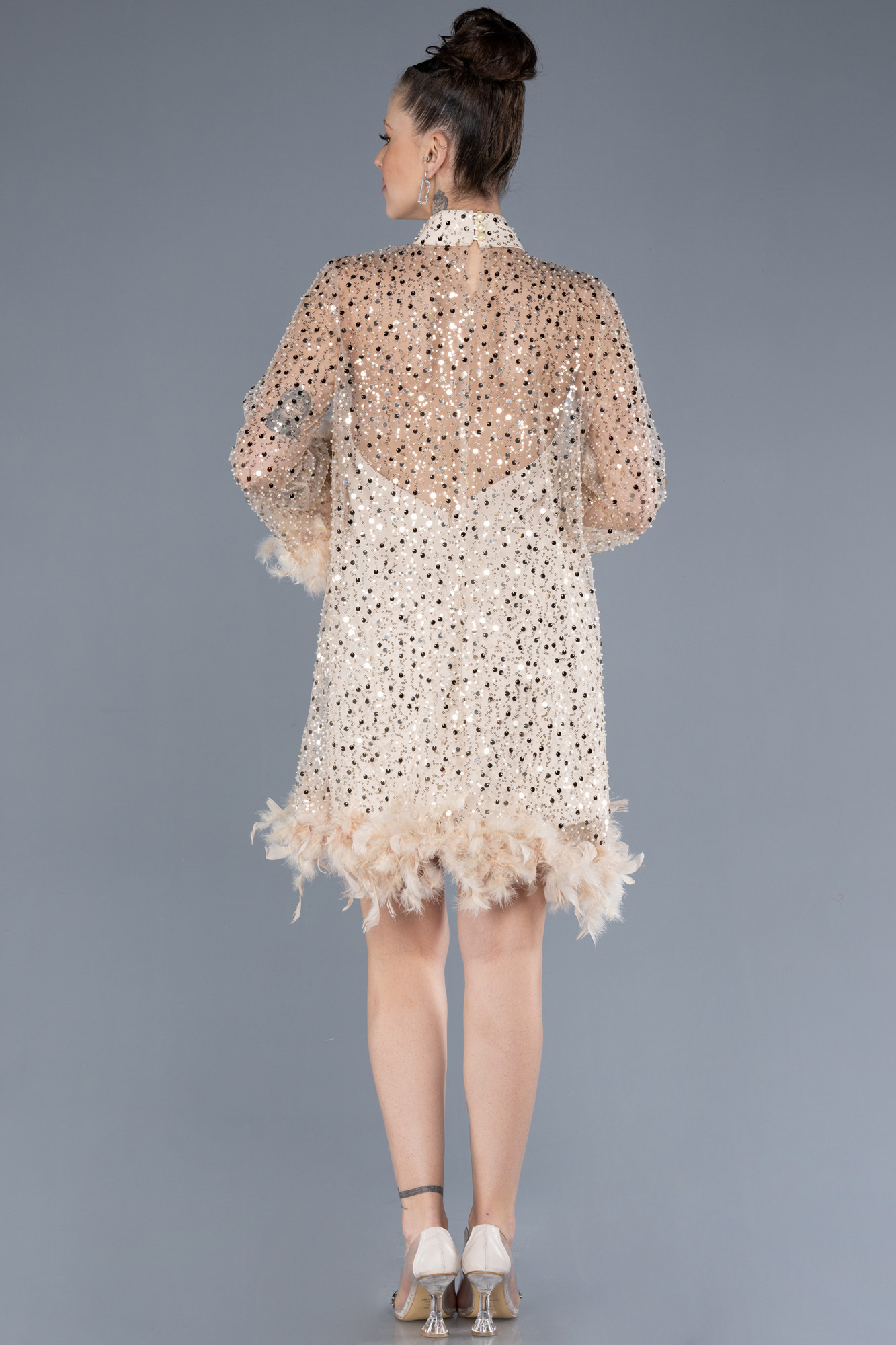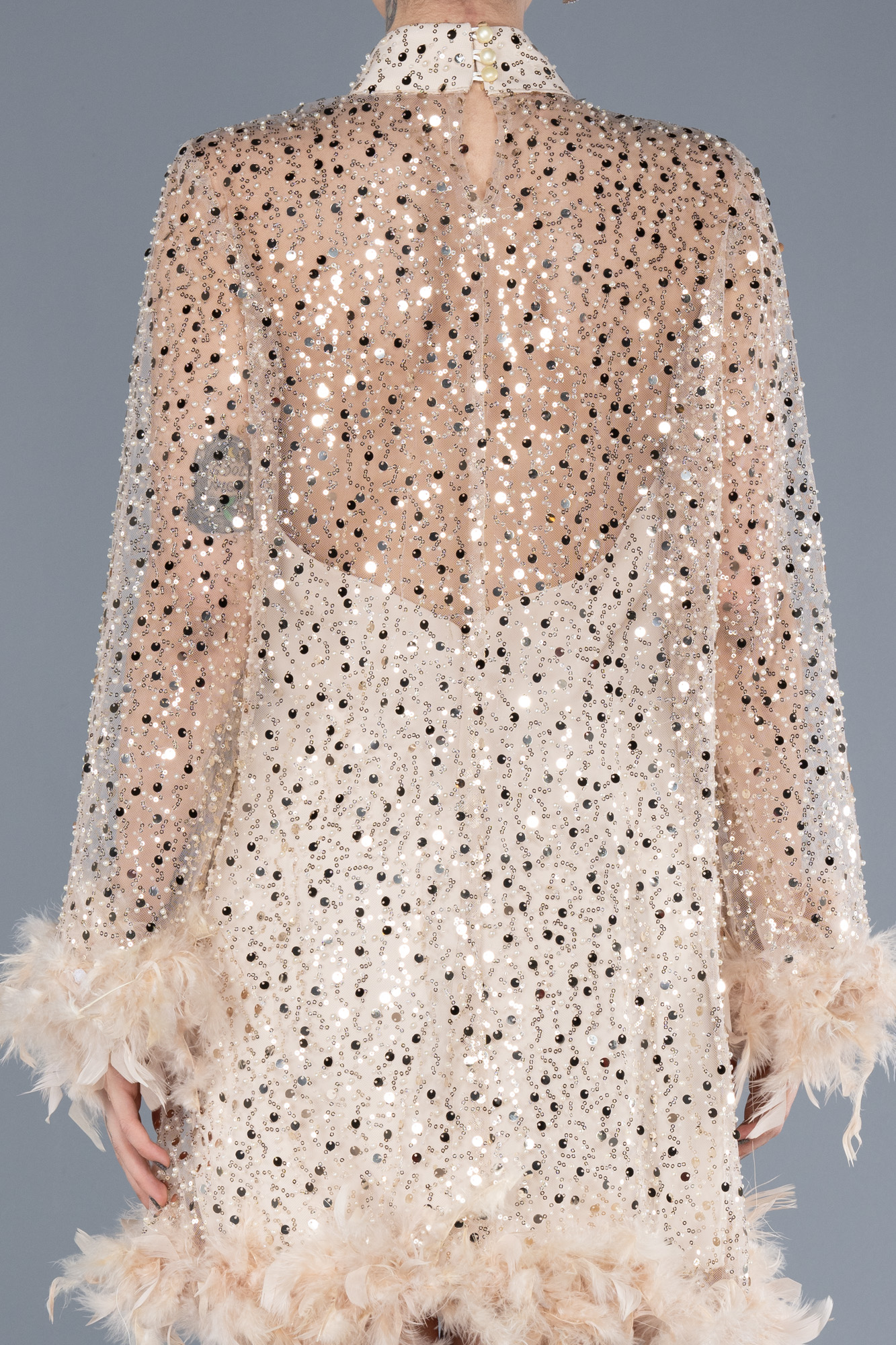 Uzun kollu kısa abiye elbise, pullu kumaştan üretilmiştir. Halter yaka tasarımı modern bir hava katarken, transparan uzun kolları ve uçlarındaki tüy detayları sofistike bir stil sunar. Elbisenin eteğindeki tüy işlemeler, tasarıma hareket ve incelik kazandırır. Nikah törenleri, nişan, kokteyl gibi özel etkinlikler için ideal bir seçimdir. Yılbaşı partilerinden after partylere kadar geniş bir kullanım alanına sahiptir.