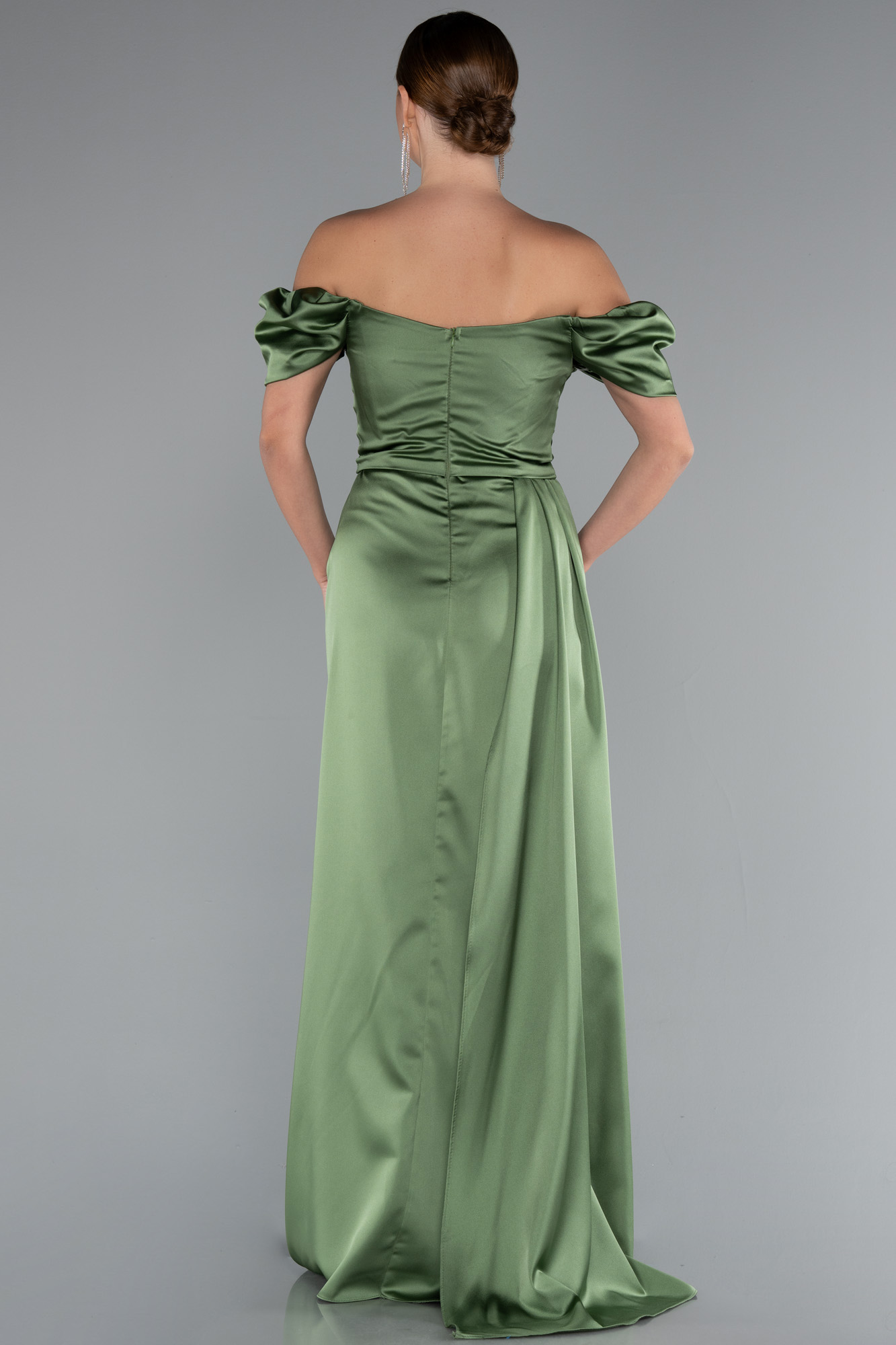 Haki Bacak Dekolteli Kayık Yaka Uzun Saten Abiye Elbise ABU1606