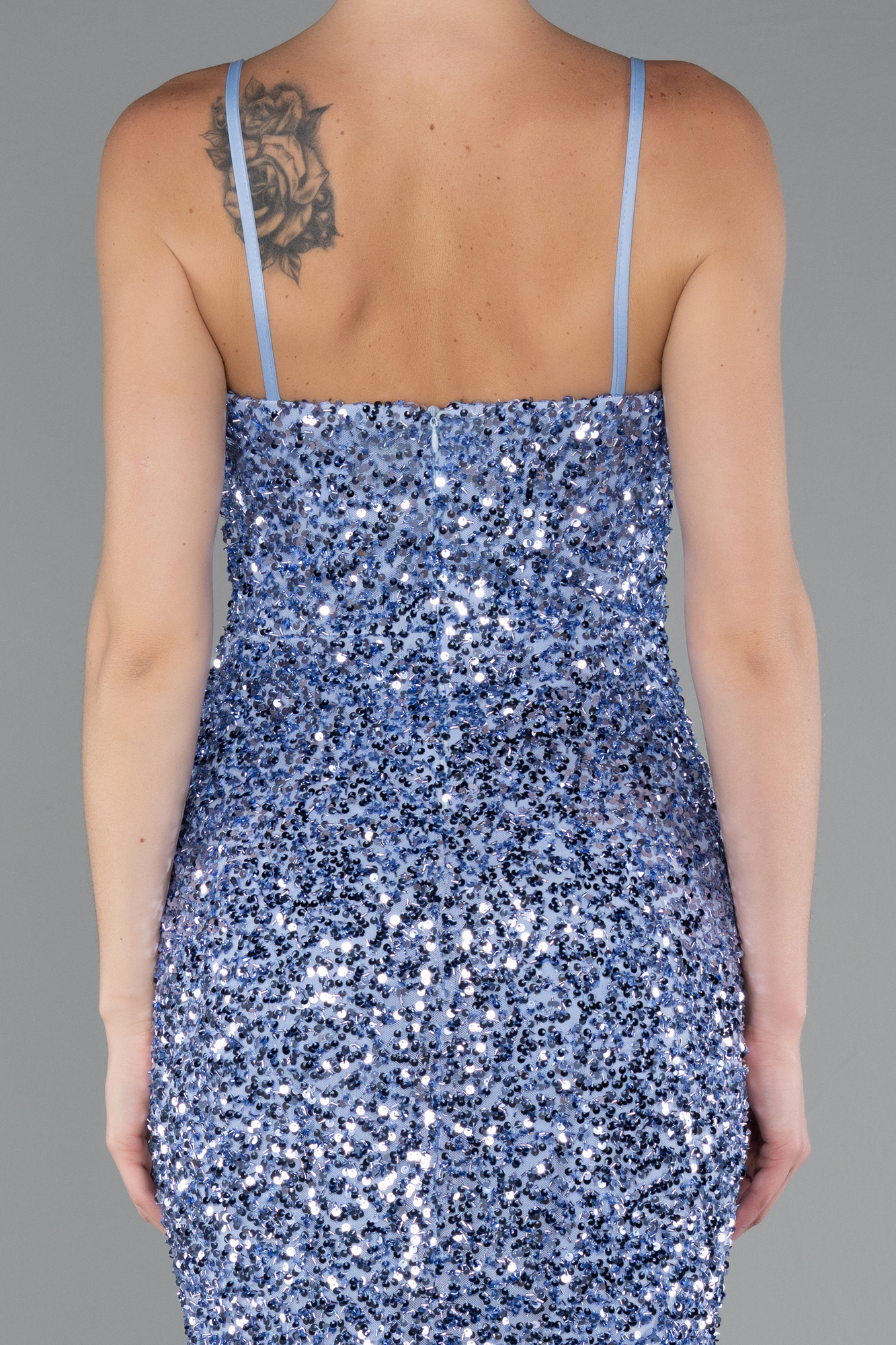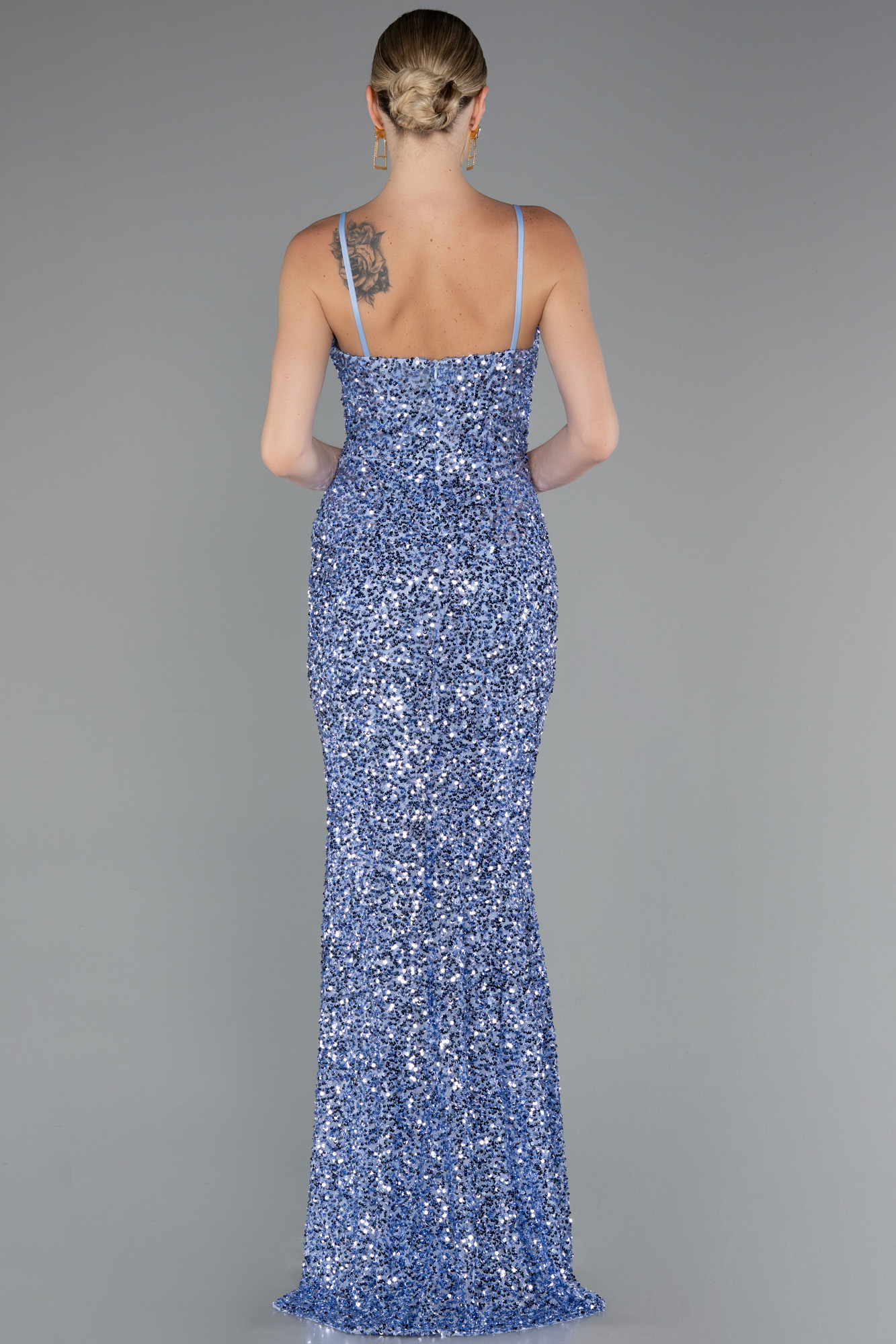 İndigo Yırtmaçlı Göğüs Drapeli Uzun Pullu Abiye Elbise ABU4842