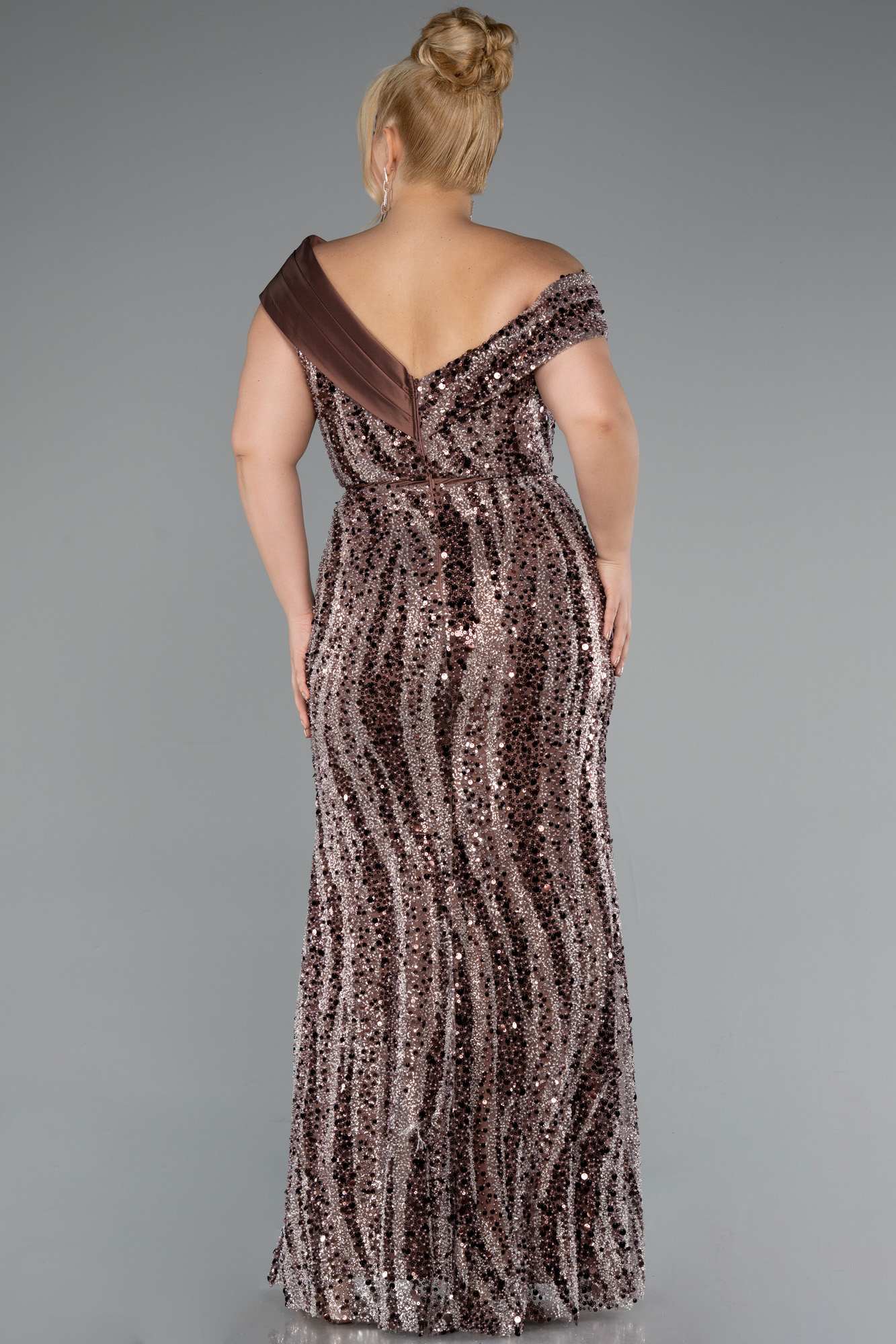 Kahve Kayık Yaka Boncuklu Uzun Büyük Beden Abiye ABU5191