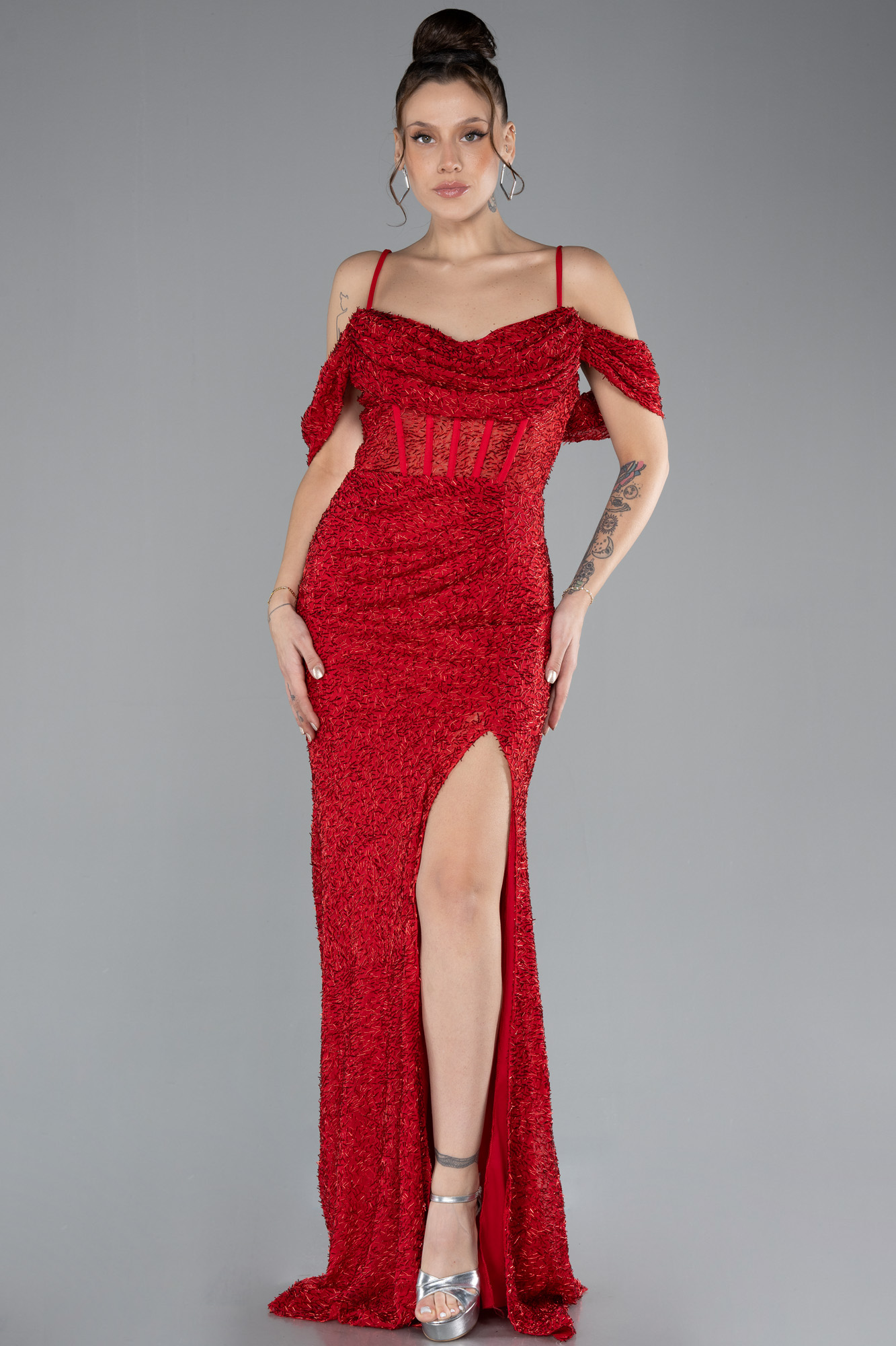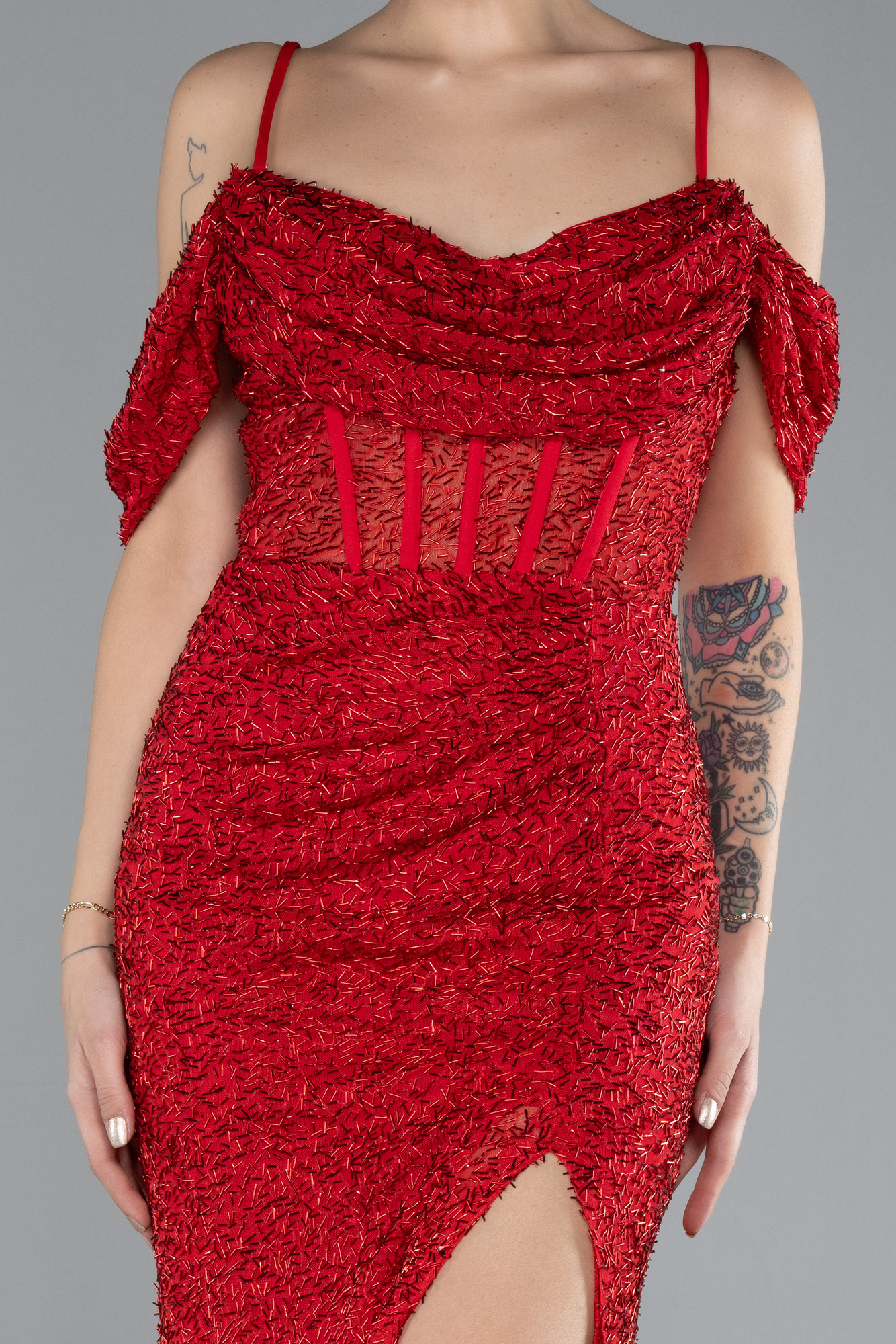 Kırmızı Bacak Ve Omuz Dekolteli Uzun Boncuklu Abiye ABU4394