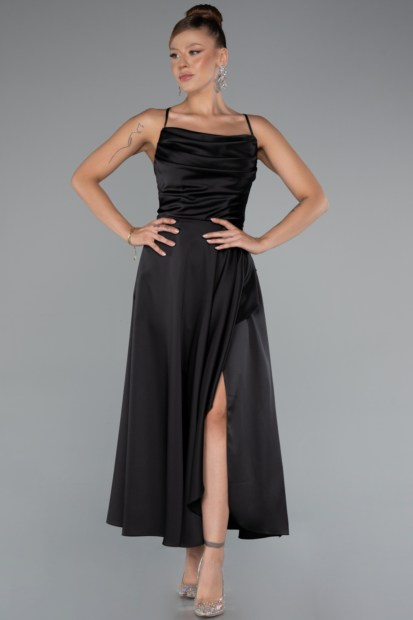 Midi boy abiye elbise modeli, saten kumaştan üretilmiştir. Askılı degaje yaka ve üst bedeni destekleyen drapeler tercih edilmiştir. Asimetrik etek kesimi sol taraftan sağ tarafa doğru kapanarak çalışılmış olup, eteği hareketlendiren volan formu ile tasarlanmıştır. Modelde ilgi çeken detaylar sırt dekolteli oluşu ve bedene göre ayarlanabilen bağcıklı olmasıdır. Mezuniyet elbisesi veya davet elbisesi olarak kullanabilirsiniz.