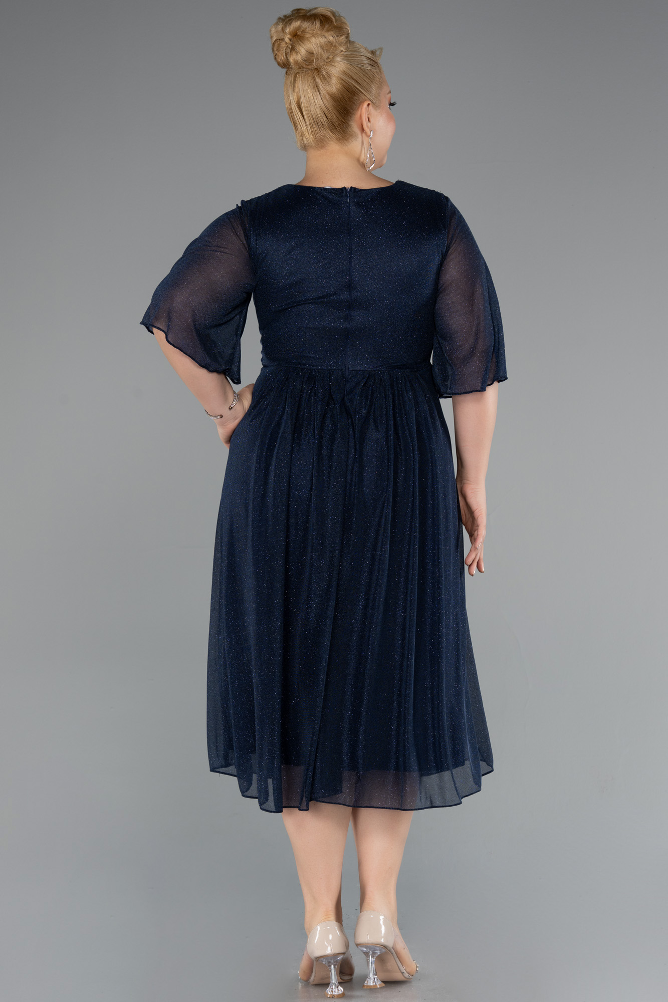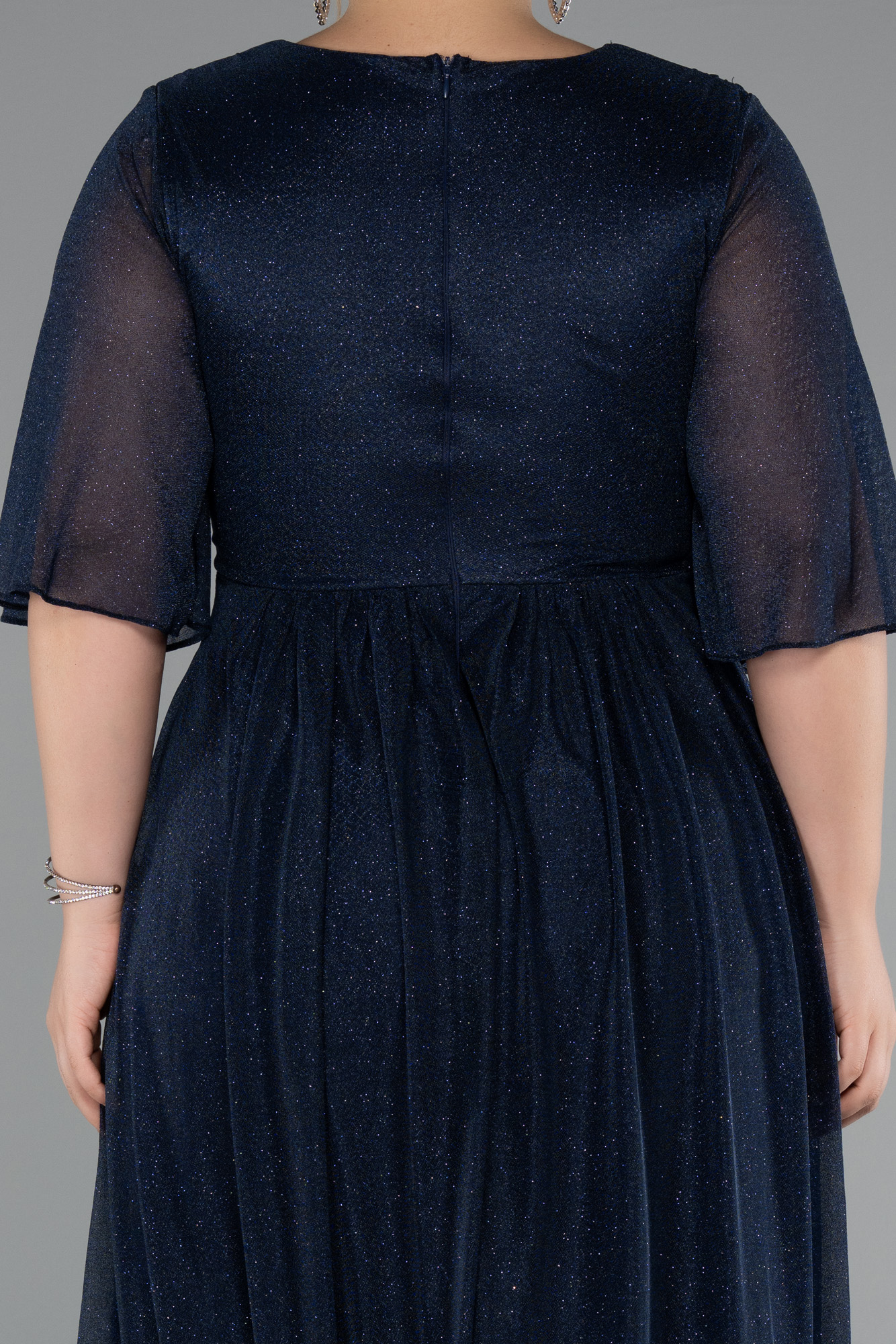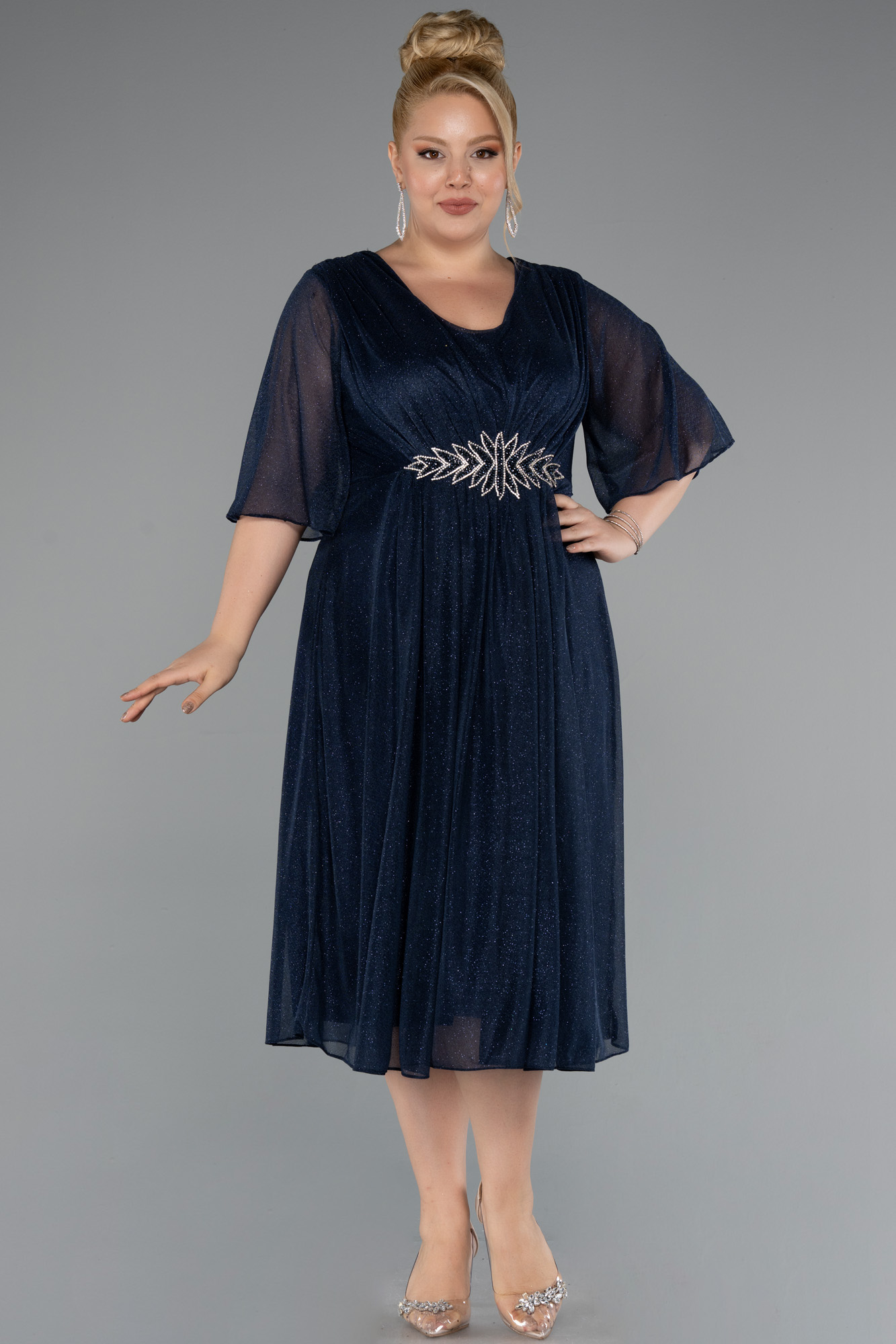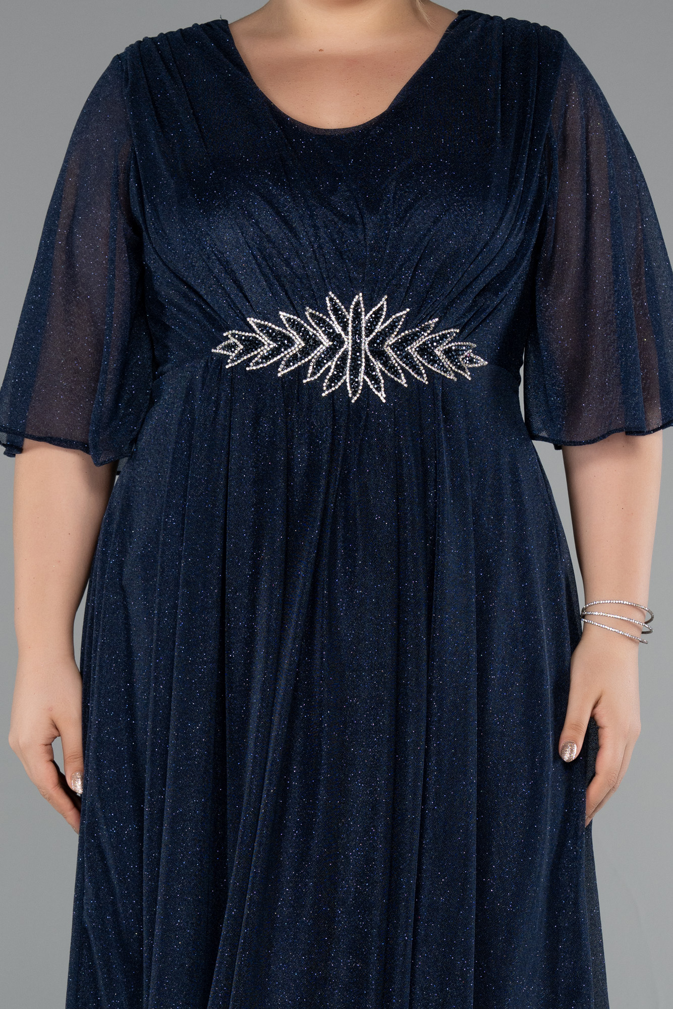 Lacivert Kısa Kol V Yaka Midi Simli Büyük Beden Abiye ABK2409