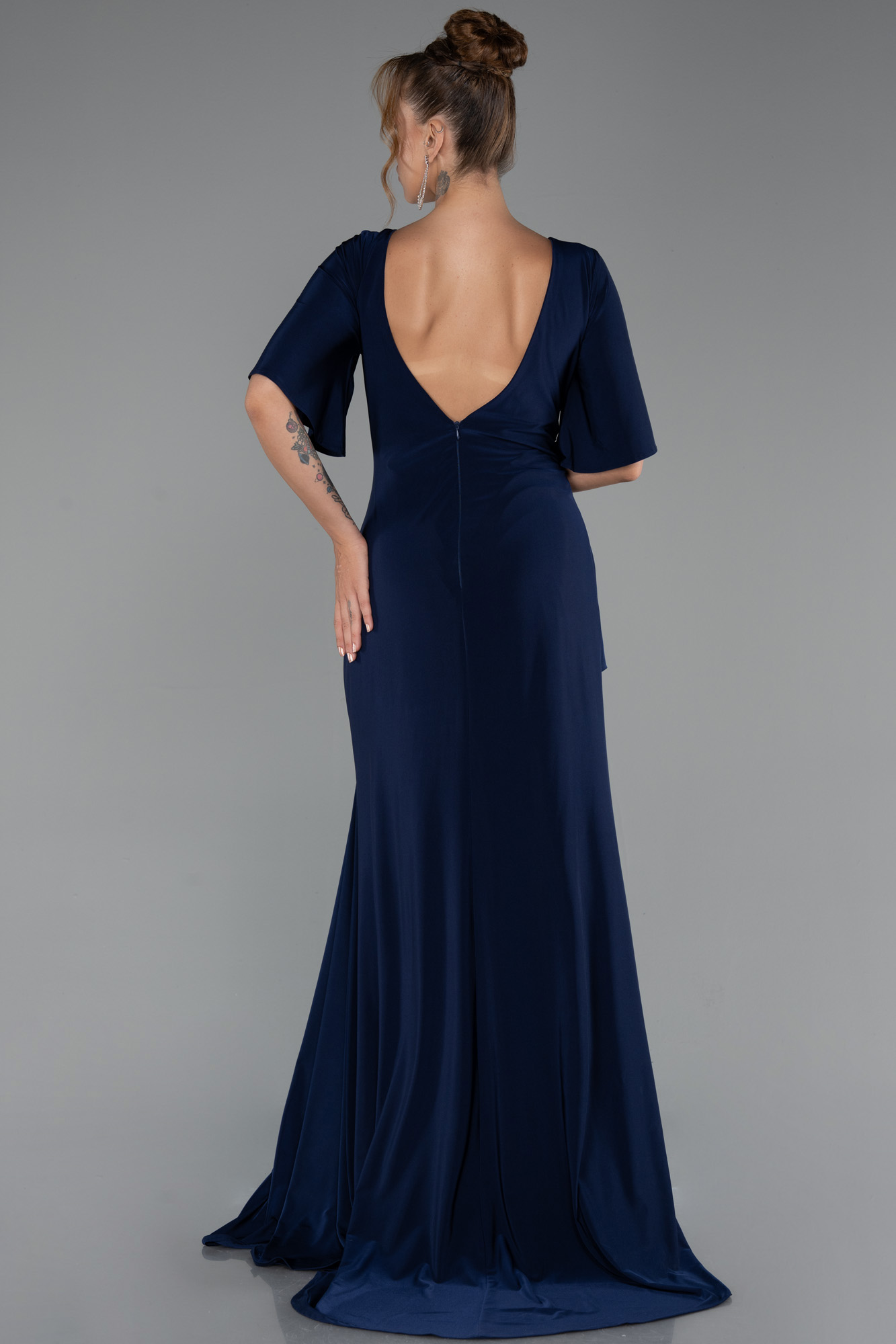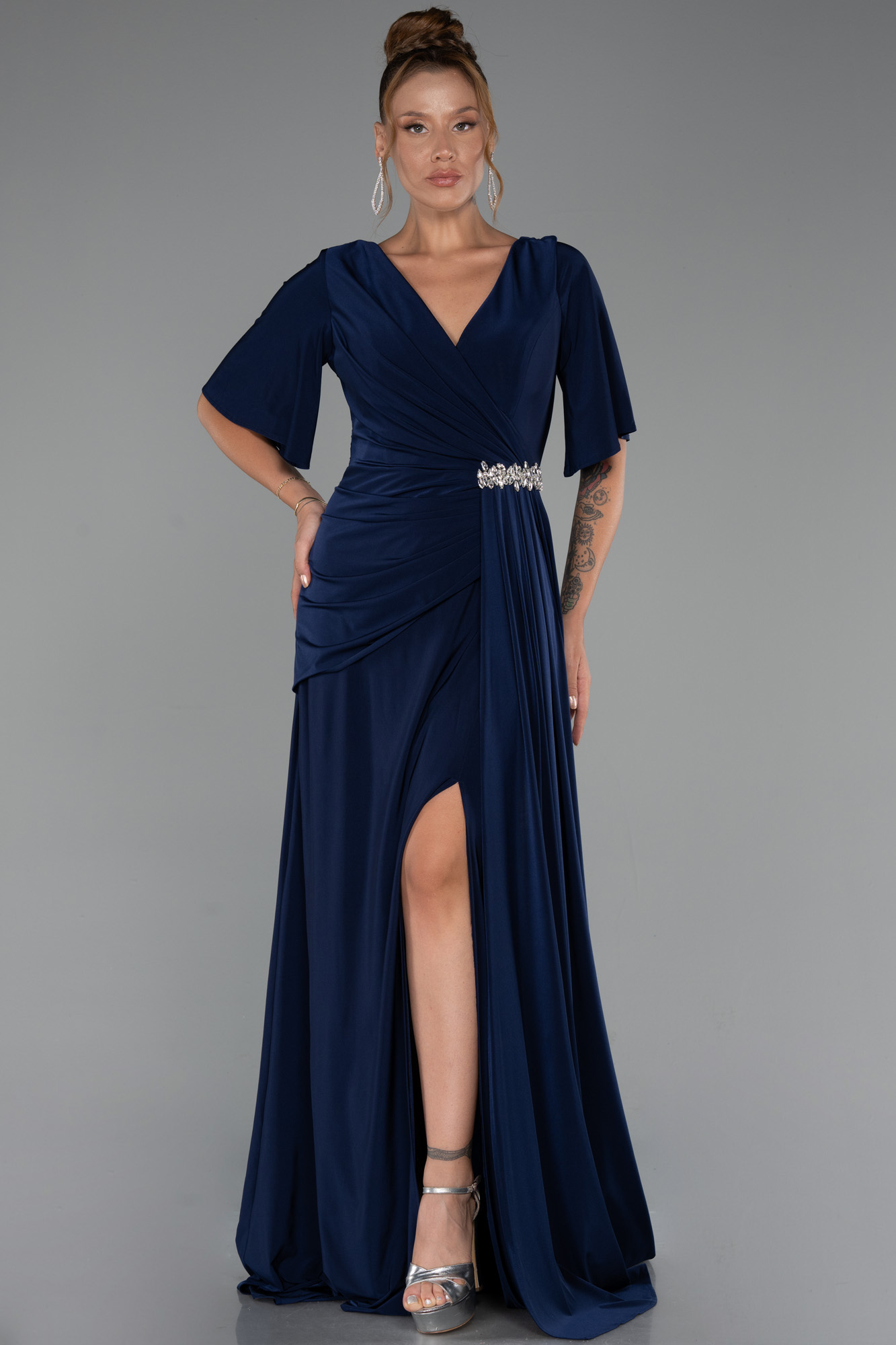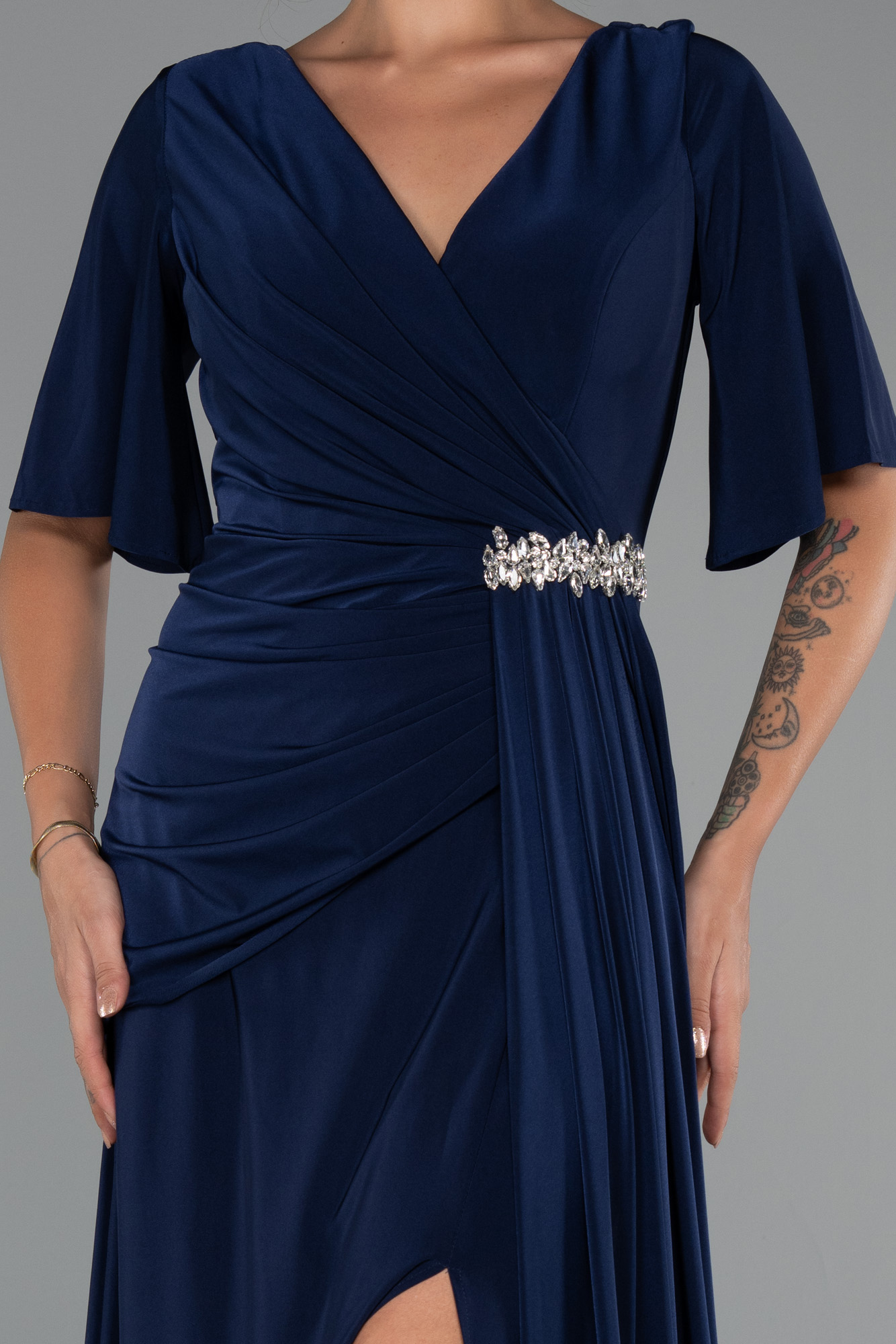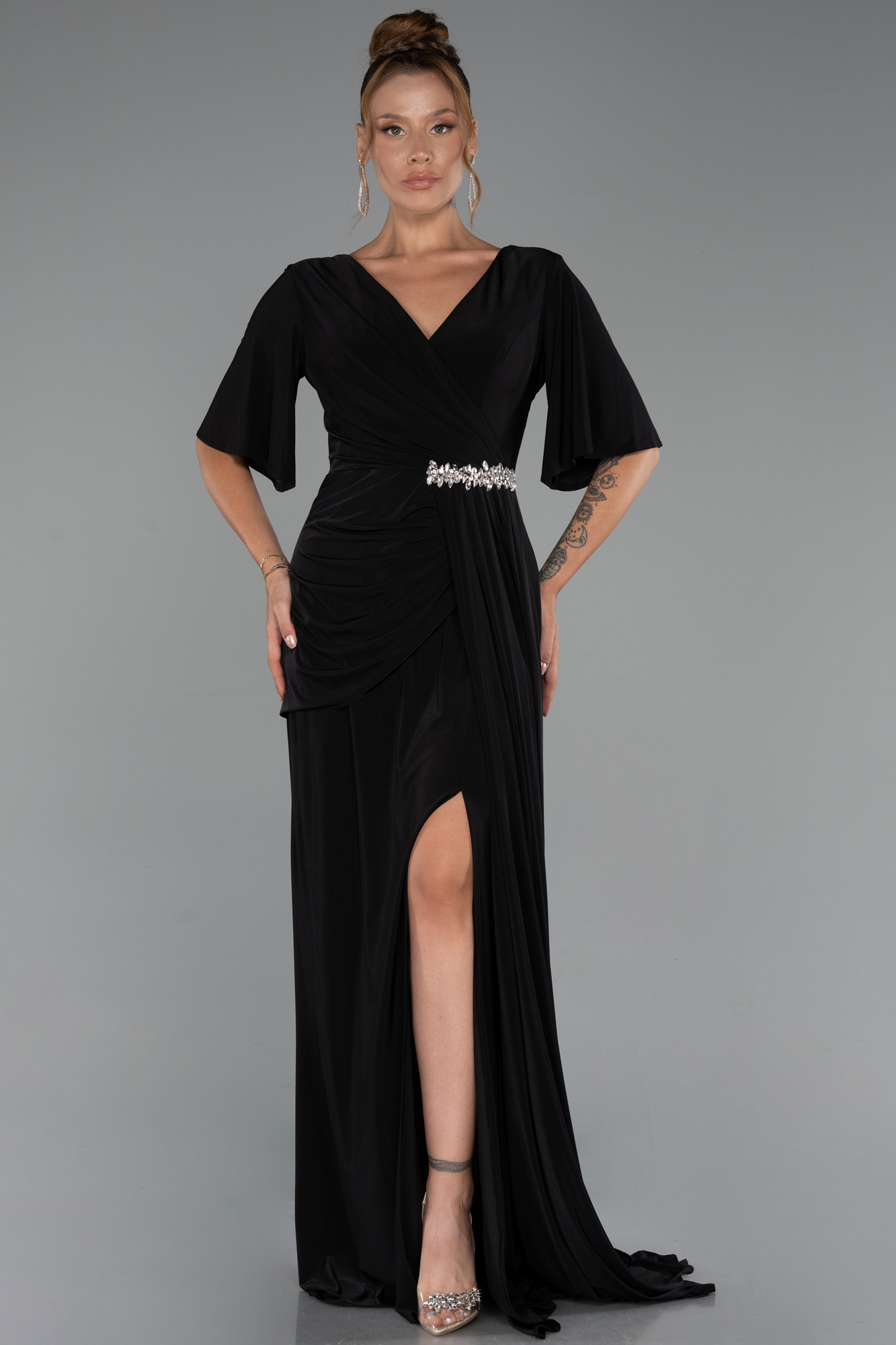 Uzun büyük beden abiye, zarif v yaka kesimi ve kısa kollu tasarımıyla rahatlık ve şıklığı bir arada sunar. Bel kısmında yer alan swarovski taş detayları ışıltılı bir dokunuş katarak elbiseye özel bir zarafet kazandırır. Akışkan görünümlü örme saten kumaşı, vücuda hoş bir uyum sağlarken yırtmaç detayı feminen bir hava katar. Kısa kollu büyük beden abiye, özel davetler, düğünler ve şık organizasyonlar için kusursuz bir seçimdir.