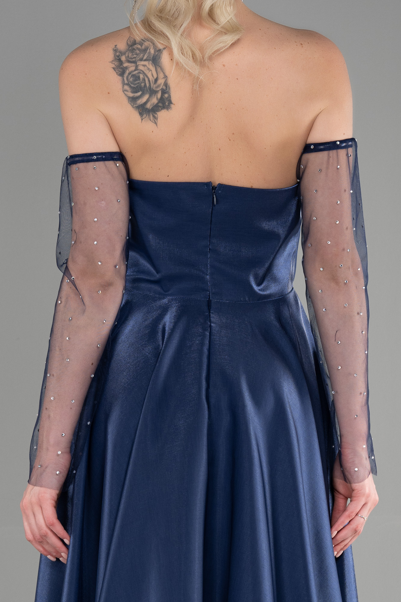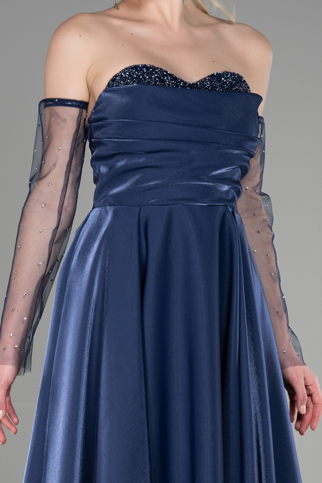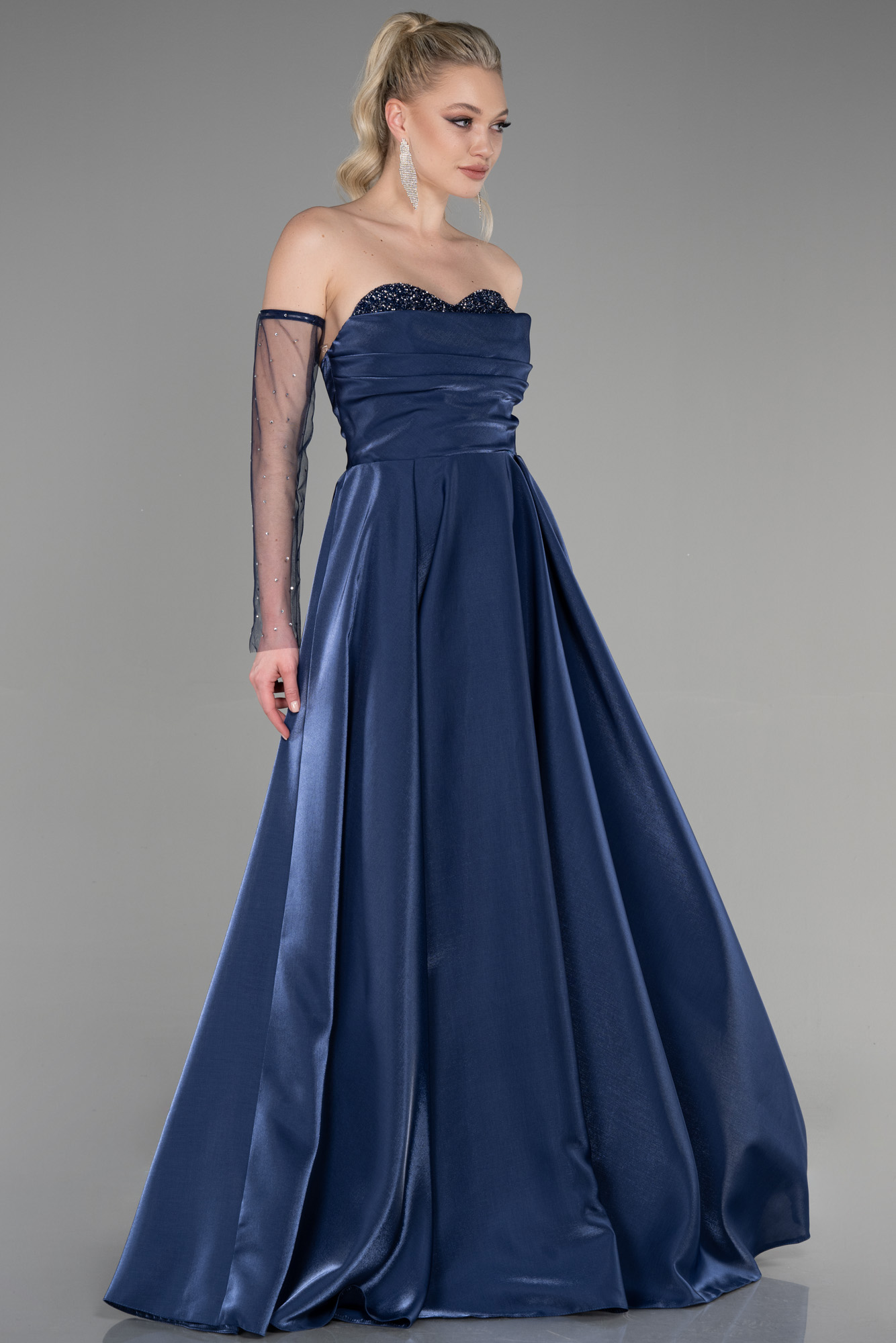 Lacivert Straplez Uzun Tül Kol Tafta Abiye Elbise ABU3604