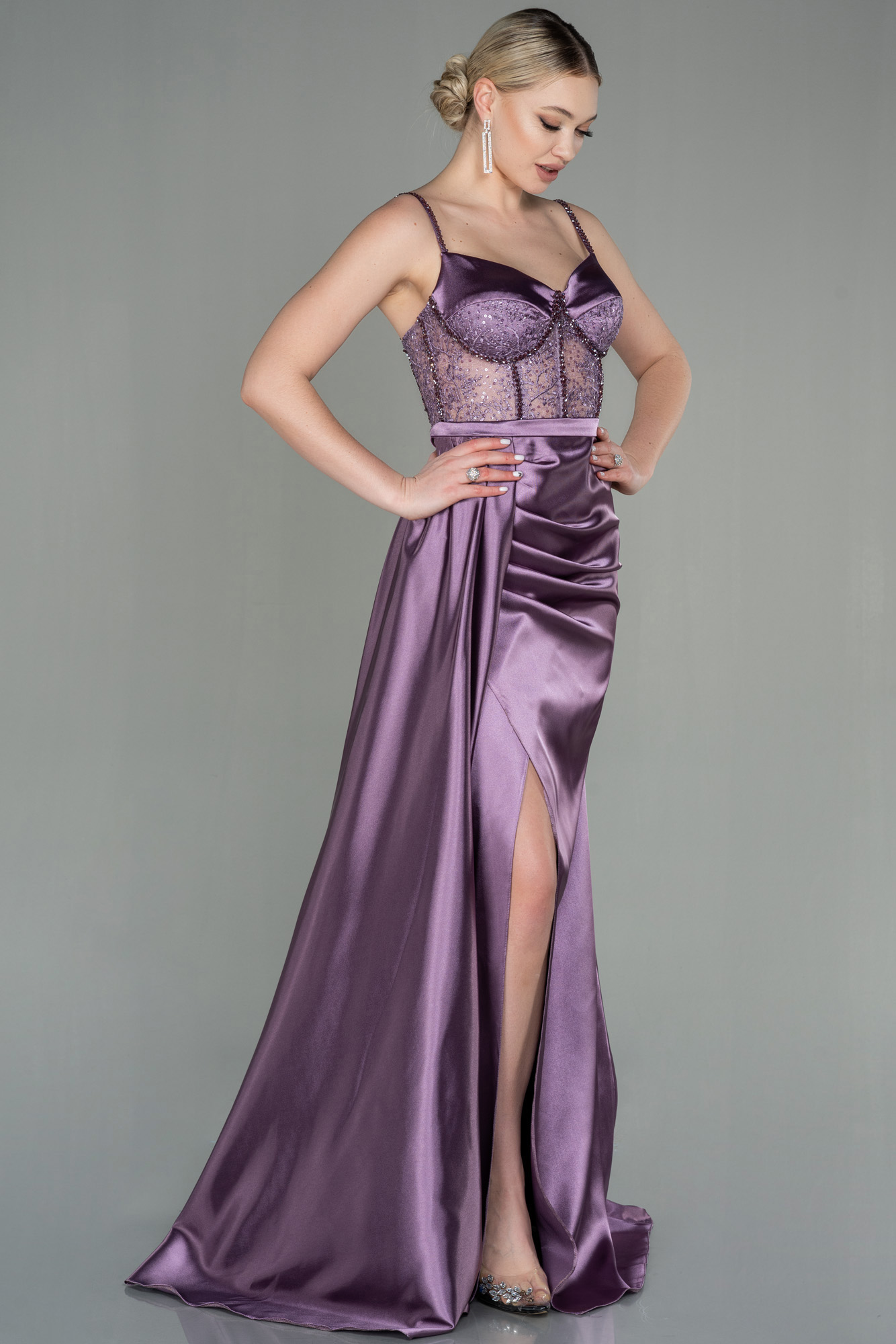 Transparan taş işlemeli uzun saten abiye elbise, göğüs kısmı glopları belirgin bir şekilde hazırlanarak balen korse detayı ile üretilmiştir. Üst bedeni tamamı transparan olup taş ilemeleri ile ışıltı kazandırılarak zenginleştirilmiştir. Etek başlangıcı hafif drapelendirilerek dökümlü bir hava sağlanmıştır. Bel hizasından başlayan kuyruk detayı bulunan askılı saten abiye derin bacak dekoltesi ile hareketlendirilmiştir.