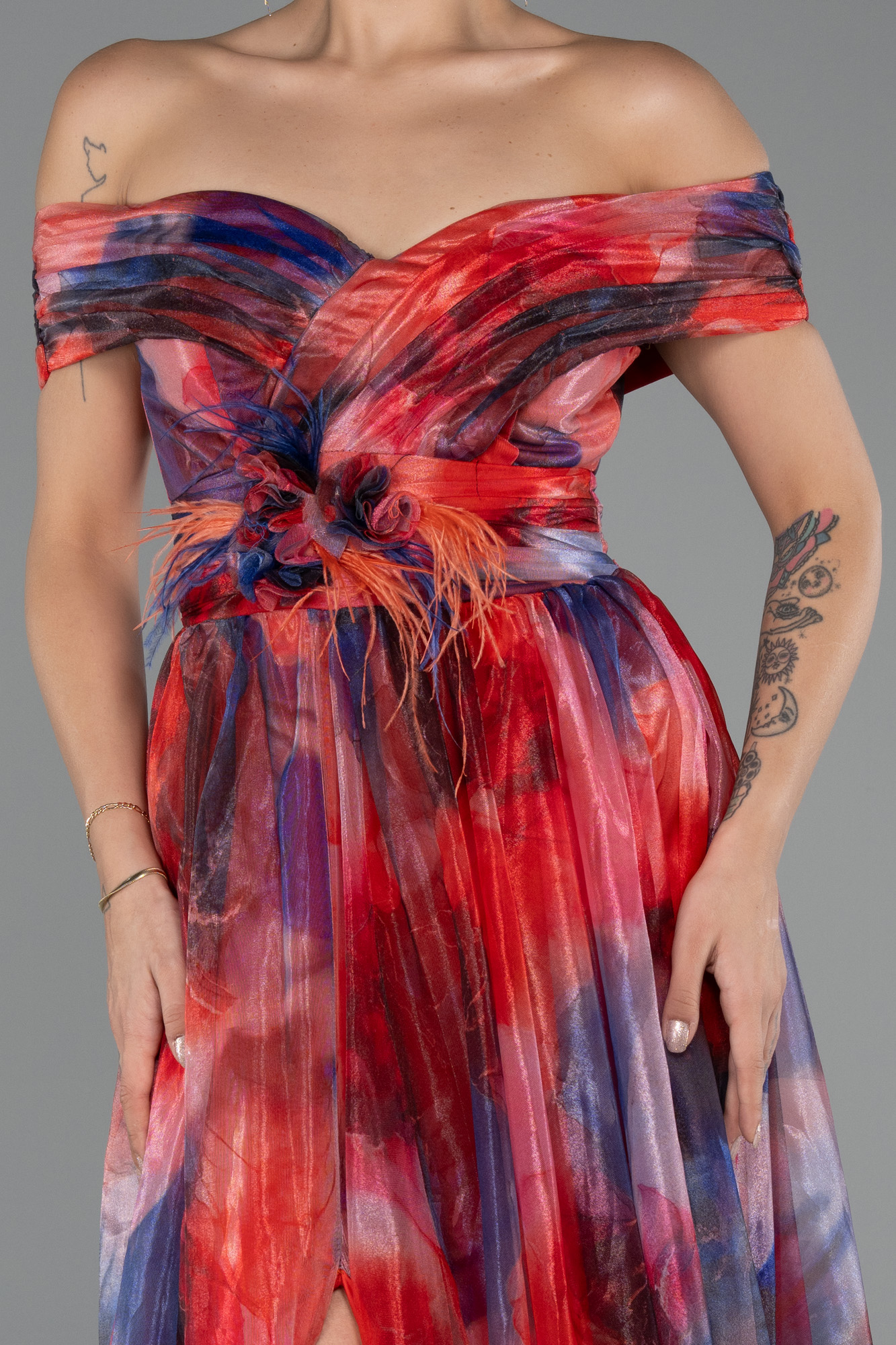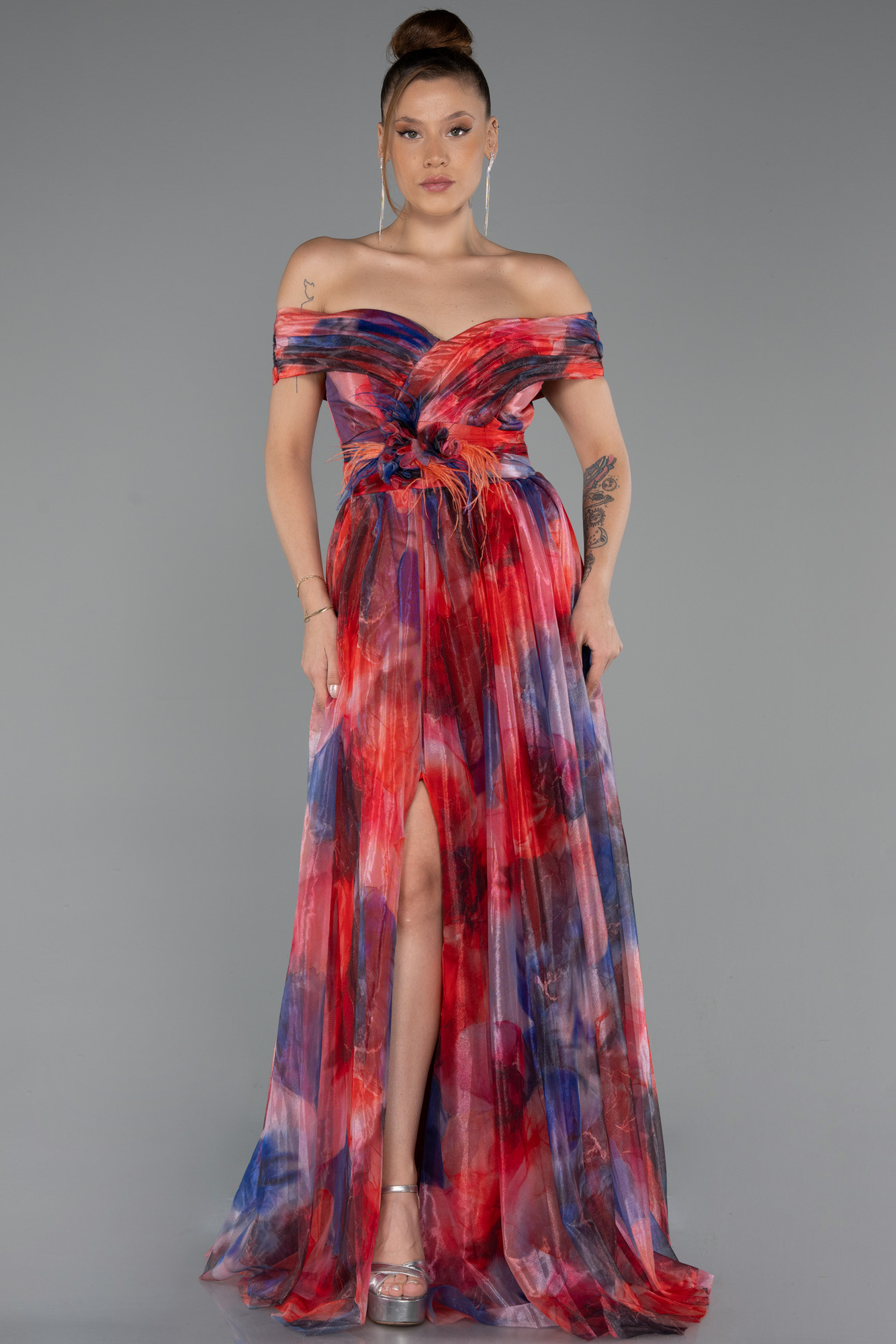Empirme büyük beden abiye, zarif tasarımıyla göz alıcı bir şıklık sunar. Kayık yaka detayı feminen bir duruş sergilerken, yırtmaç dekoltesi elbiseye modern bir hava katmaktadır. Bel kısmında yer alan çiçek formundaki detay ise tasarımı romantik bir dokunuşla tamamlar. Renk geçişleriyle dikkat çeken empirme kumaşı, akıcı eteğiyle hareketli bir siluet oluşturur. Özel davetlerden düğünlere kadar birçok ortamda tercih edilebilecek model, rahat kalıbıyla konforu ve zarafeti bir arada sunar.