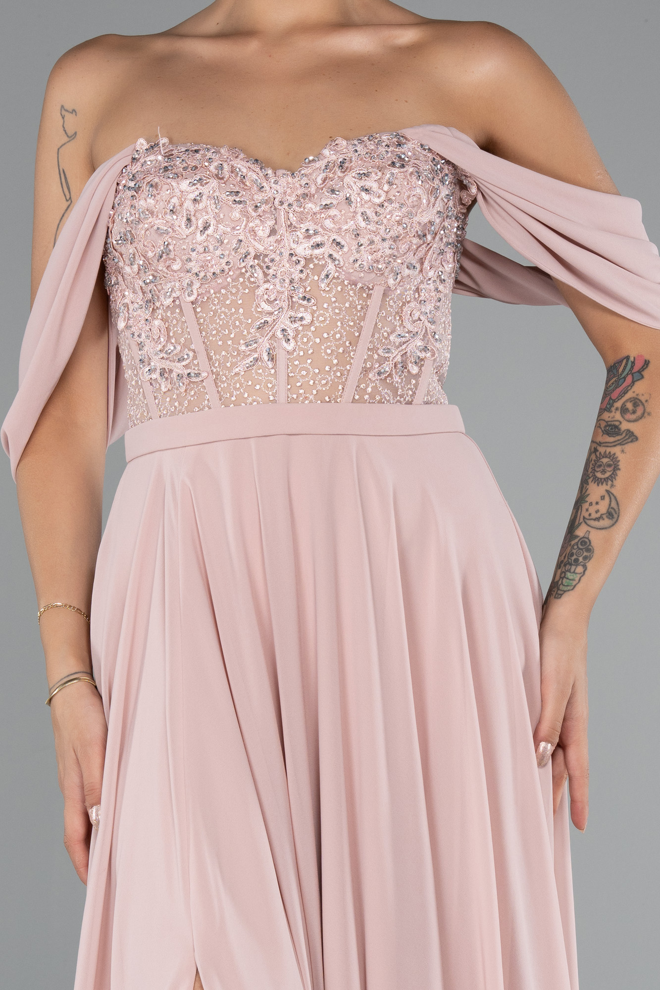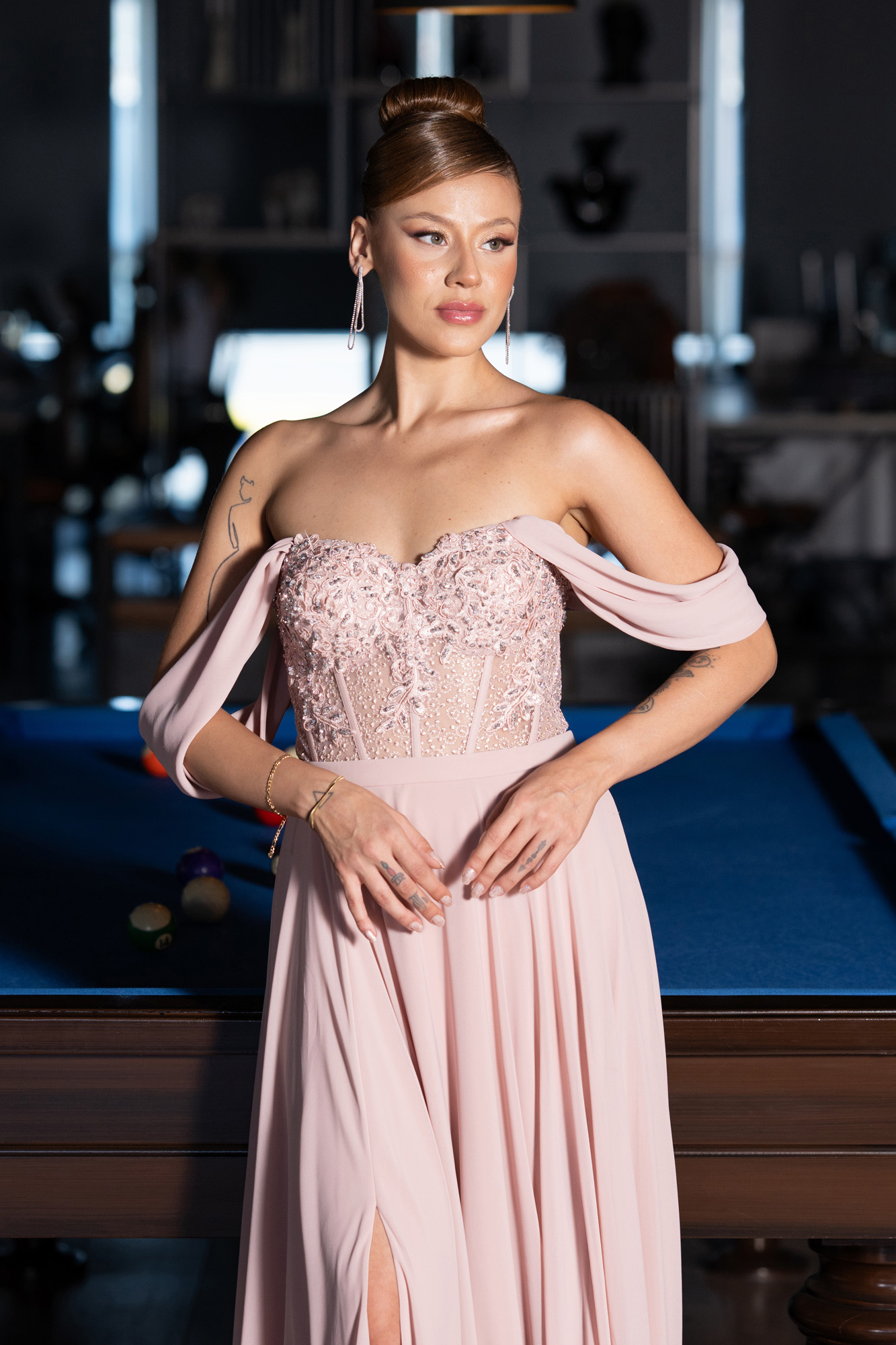 Uzun abiye elbise, üst bedeni işlemeli transparan kayık yaka detayına sahiptir. Üst bedeninde yer alan dantel işlemeli tasarım, elbiseye zarif bir hava katarken, transparan detayıyla da cesur bir görünüm sağlamaktadır. Kayık yaka elbisenin eteği ise şifon kumaştan üretilmiştir, bu da elbiseye hafiflik ve hareketlilik katmaktadır. Etekteki yırtmaç detayı ise bacaklara zarif bir vurgu yaparken, aynı zamanda hareket özgürlüğü sağlar. Nişan elbisesi olarak tercih edilebileceği gibi, ekru rengi ise nikah elbisesi olarak da mükemmel bir seçim olabilir.