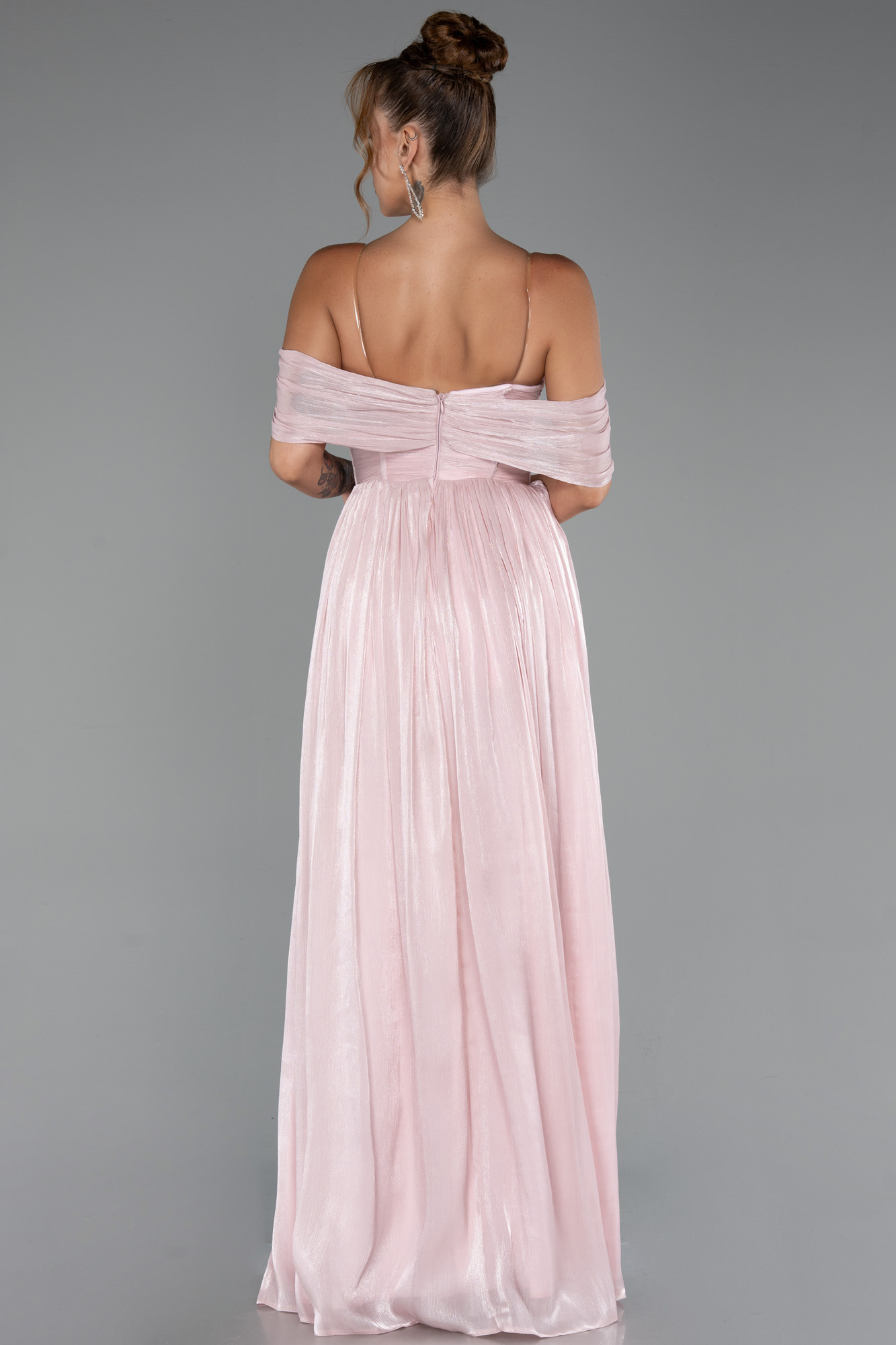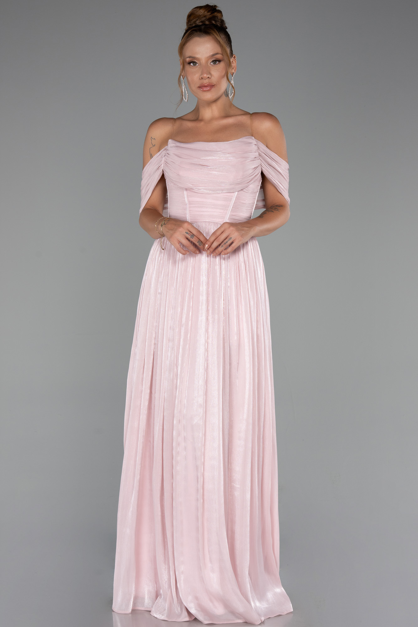 Pudra Kayık Yaka Ateş Pile Uzun Şifon Abiye ABU5283