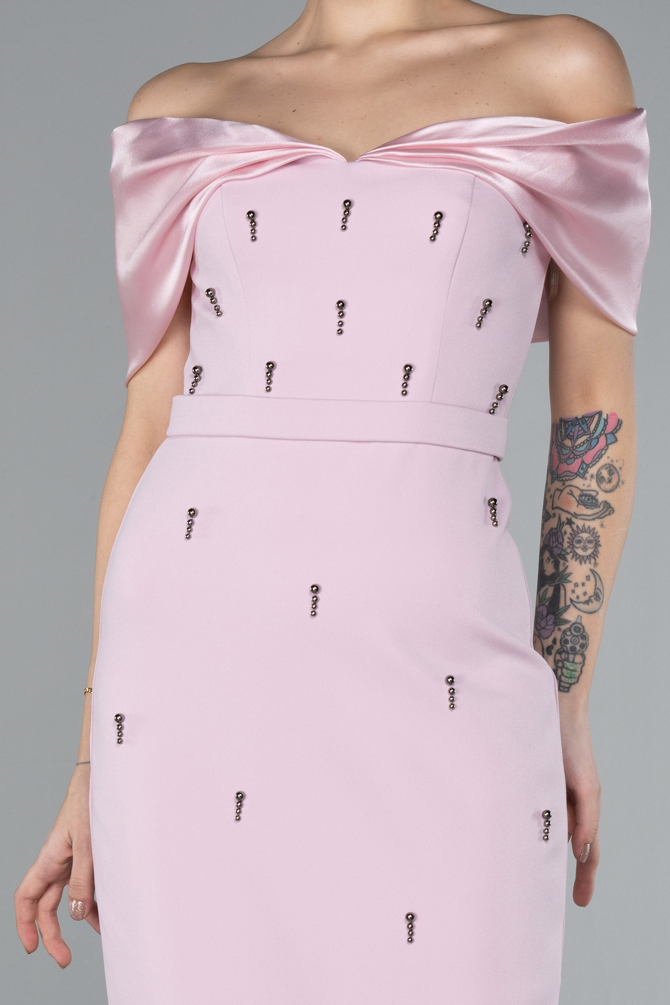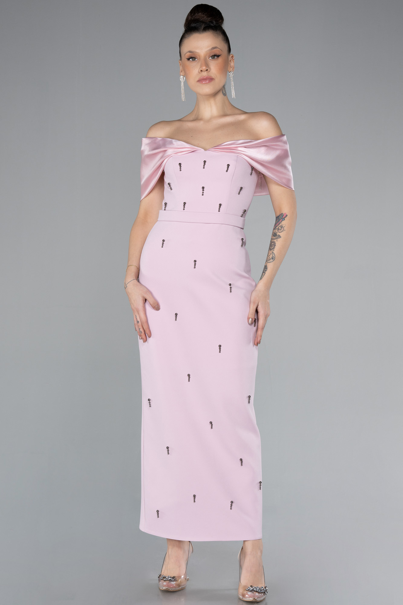 Pudra Kayık Yaka Taşlı Midi Davet Elbisesi ABK2212