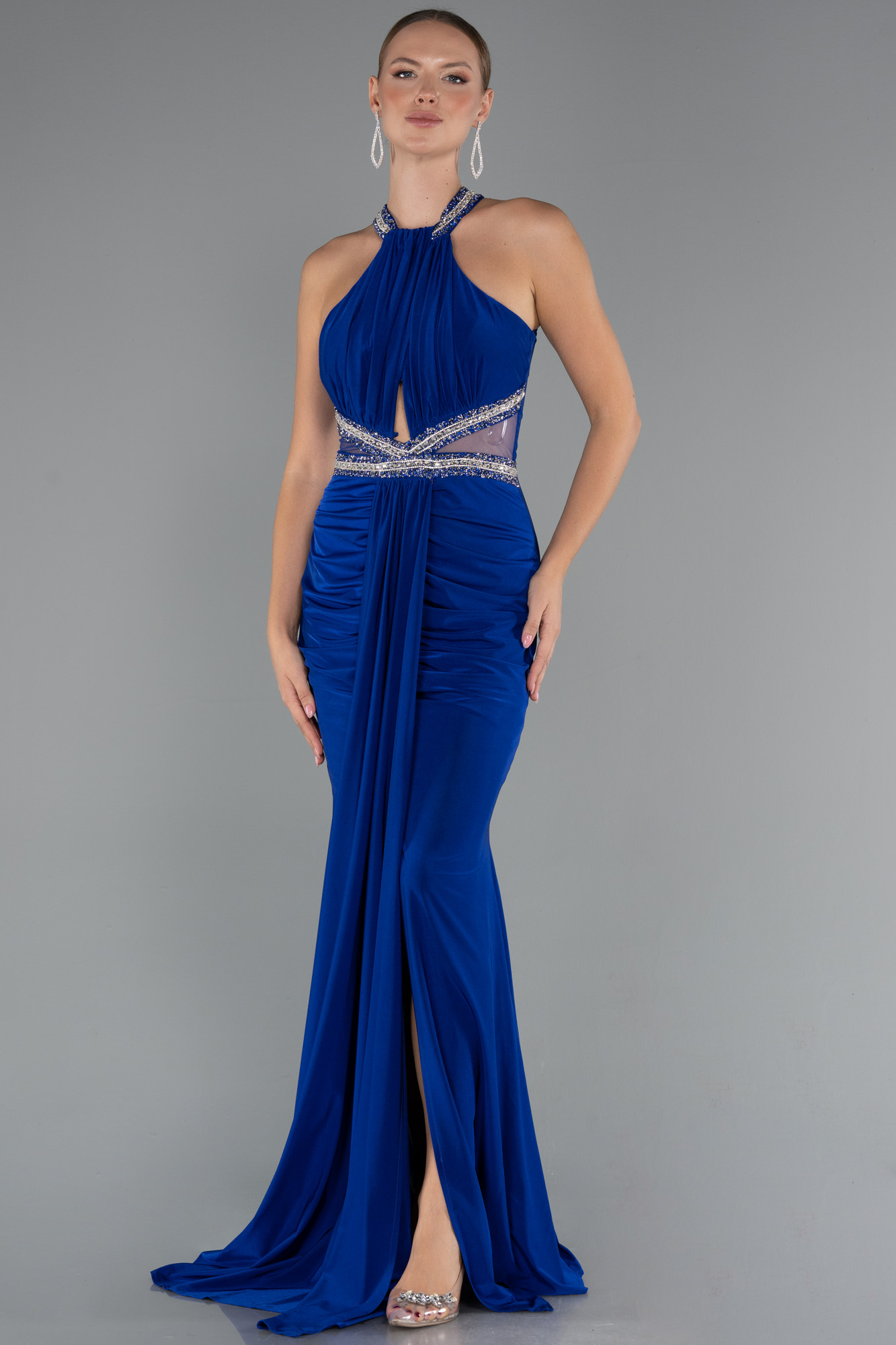 Saks Mavi Halter Yaka Bacak Dekolteli Uzun Abiye Elbise ABU5258