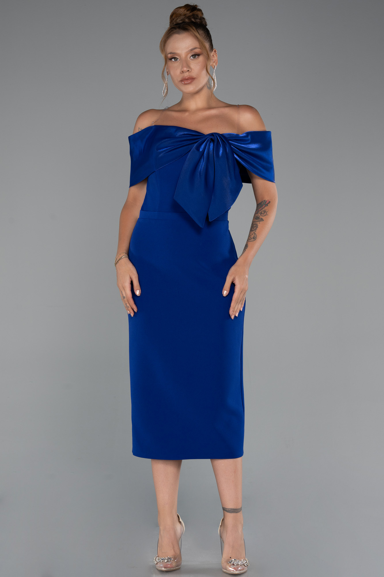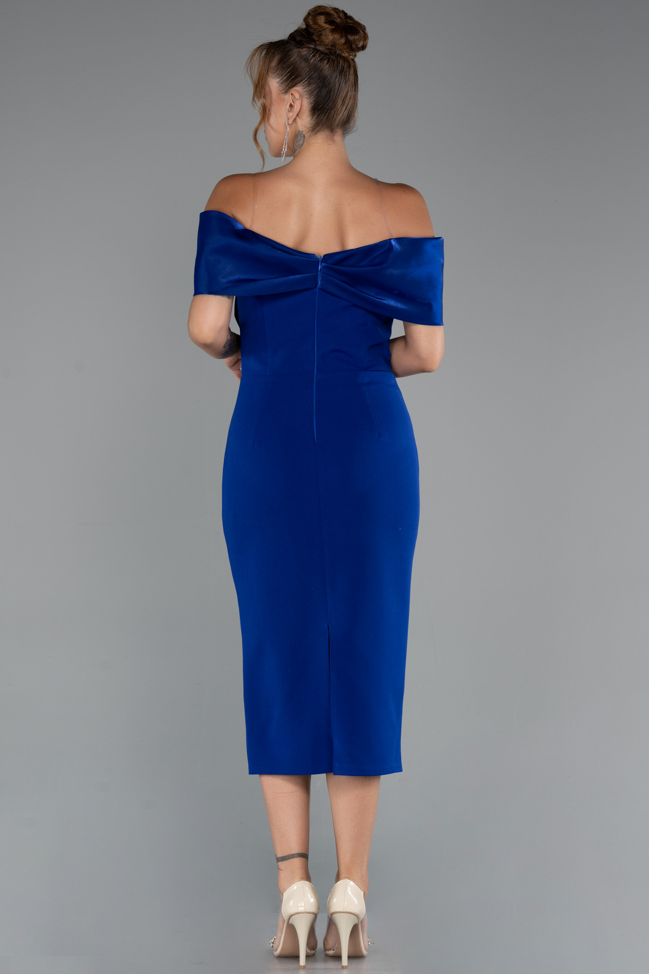 Saks Mavi Saten Kayık Yaka Midi Davet Elbisesi ABK2263