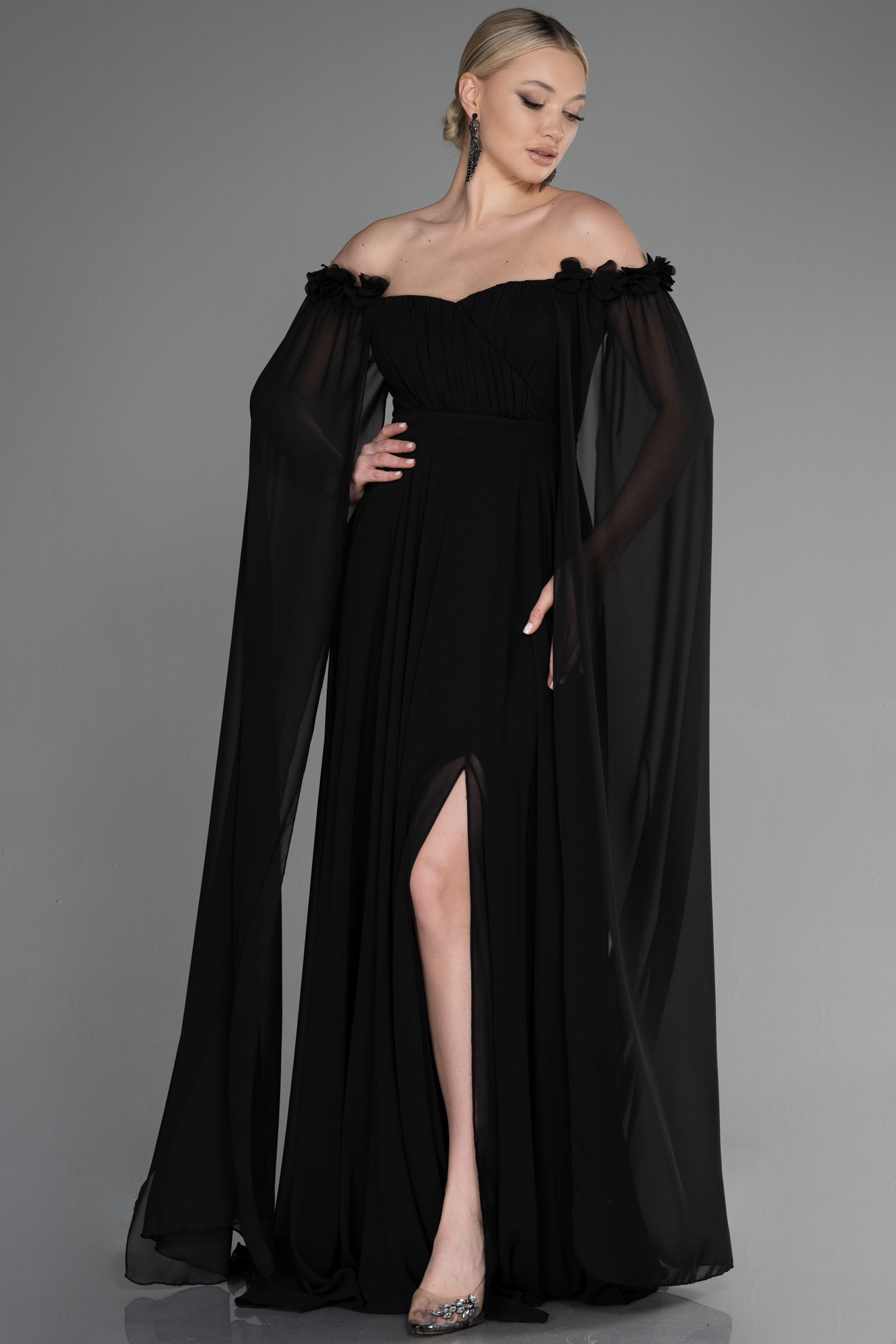 . Kayık yaka uzun abiye elbise, şifon kumaşın zarif dokusuyla üretilmiş benzersiz bir tasarımdır. Pelerin kollar, elbisenin ana özelliklerinden biridir. Kolunuzdan sarkan hafif kumaş pelerin detayı elbisenin görünümünü zenginleştirir. Şifon pelerinli elbisenin önünde yer alan yırtmaç, bacaklarınızı zarif bir şekilde vurgular. Ekru rengi, nikah elbisesi olarak mükemmel bir tercihtir.