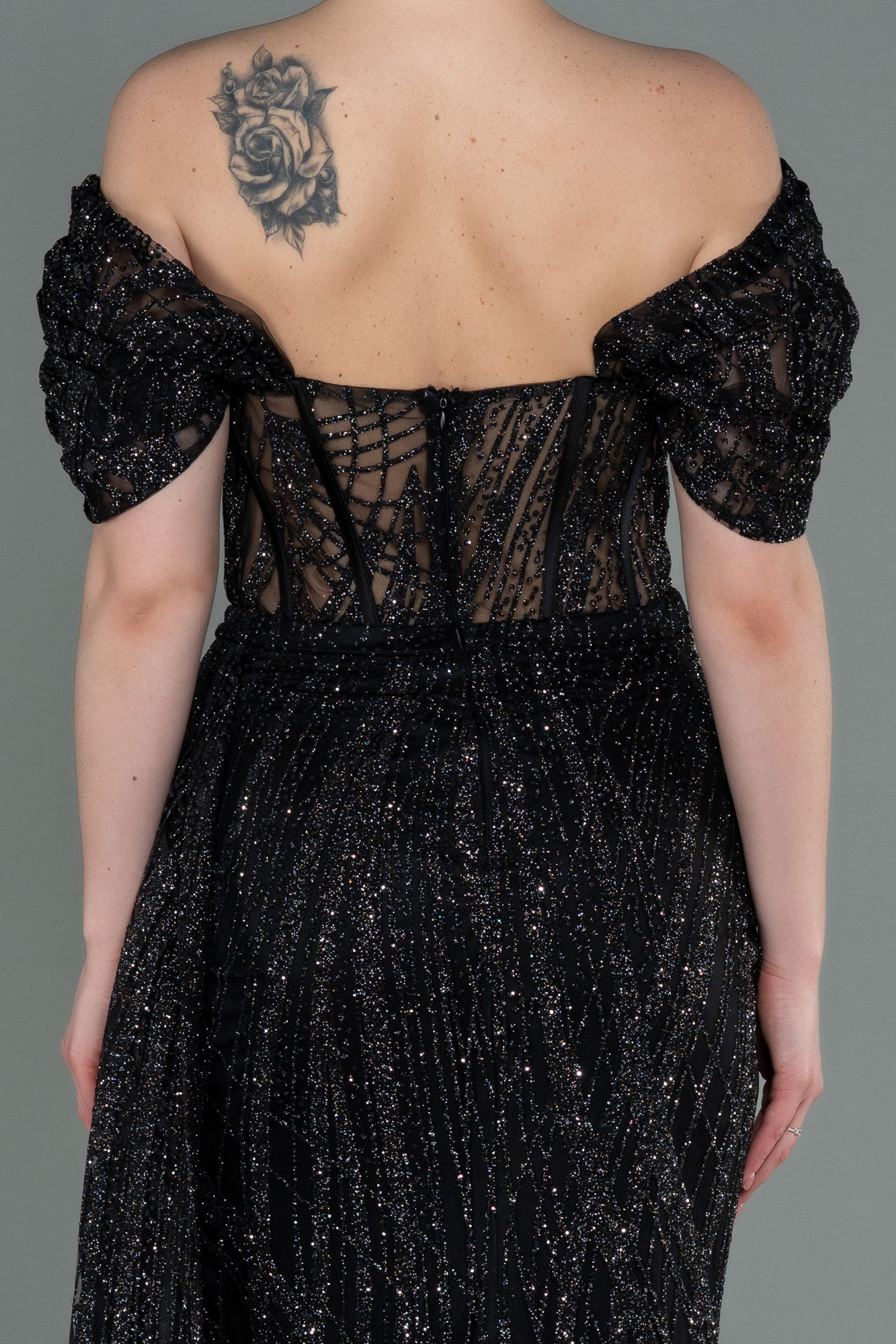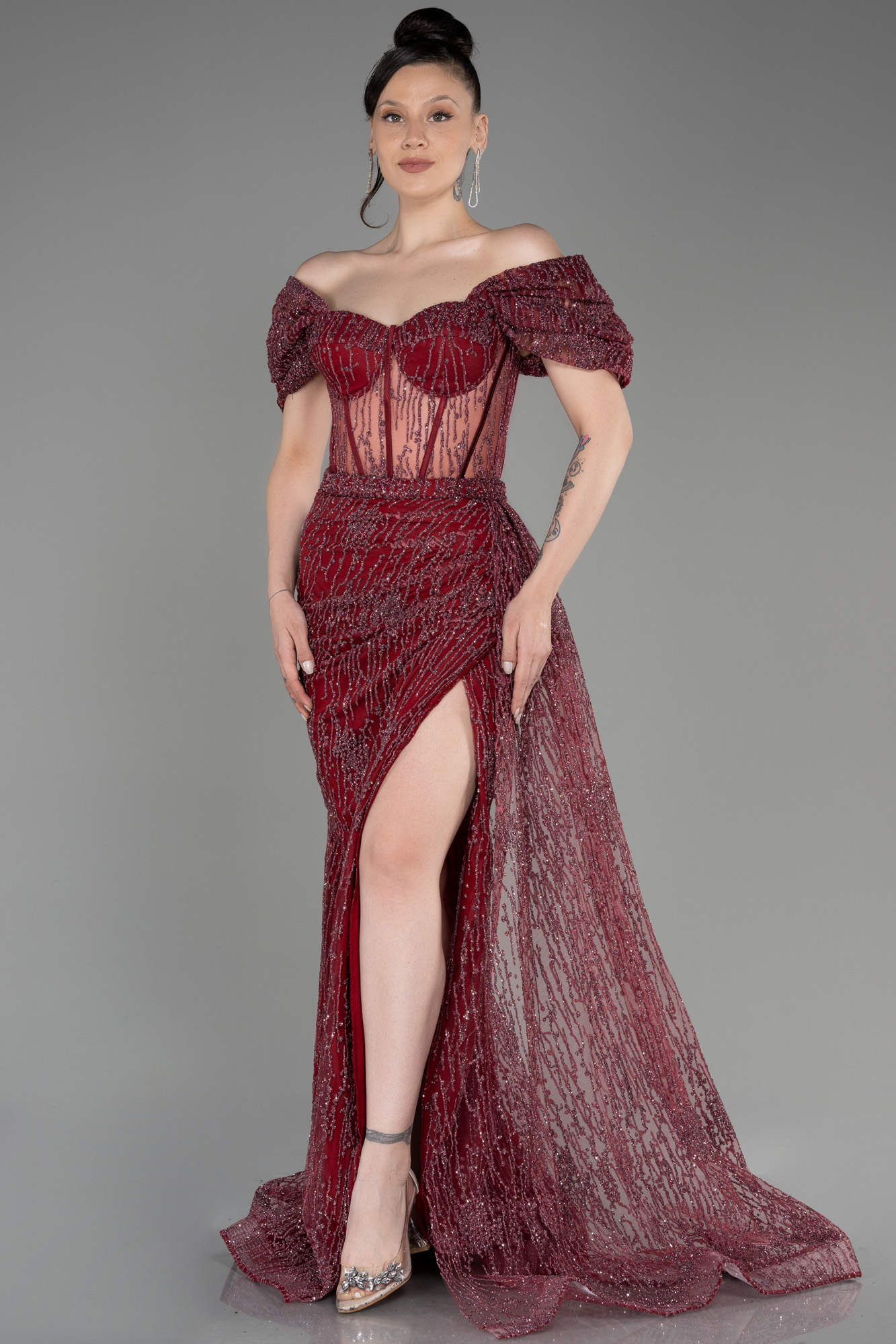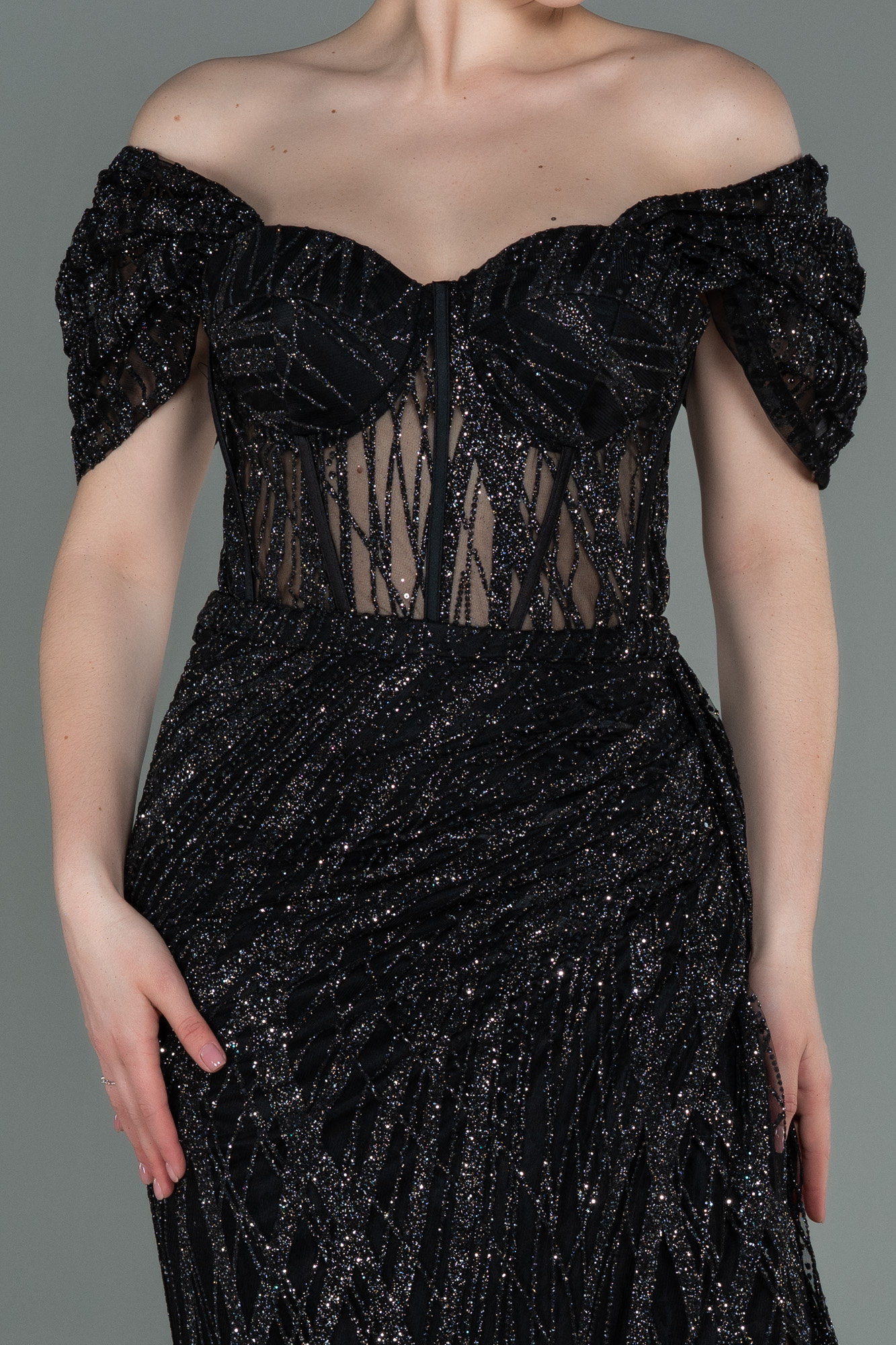 . Kayık yaka olarak hazırlanan uzun abiye elbise modelimiz, simli kumaş yapısı ile üretilmiştir. Göğüs kupları belirginleştirilen kayık yaka abiye elbise balen korse detayı ile tasarlanmıştır. Üst bedeni transparan hazırlanan simli abiye elbise modelimiz, ışıltılı simli desenler ile zenginleştirilmiştir. Aynı kumaştan üretilen bel hizasından başlayan kuyruk detayı ile hareketlendirilmiştir. Yırtmaç kesimiyle derin bacak dekolteli detaylandırılan uzun abiye elbise modelimizi nişan elbisesi olarak tercih edebilirsiniz.