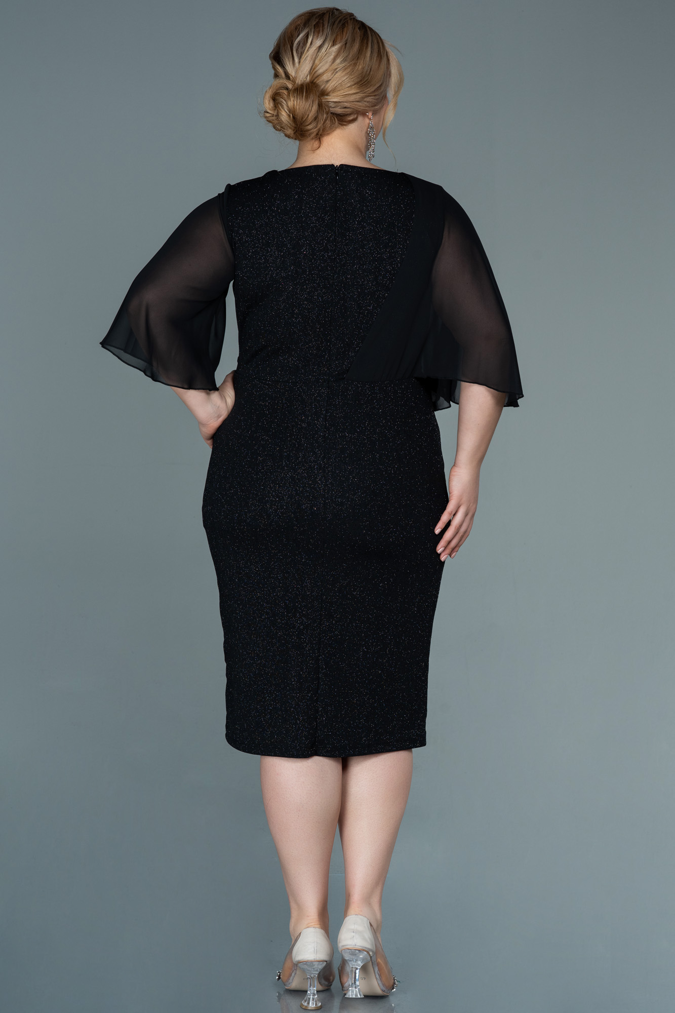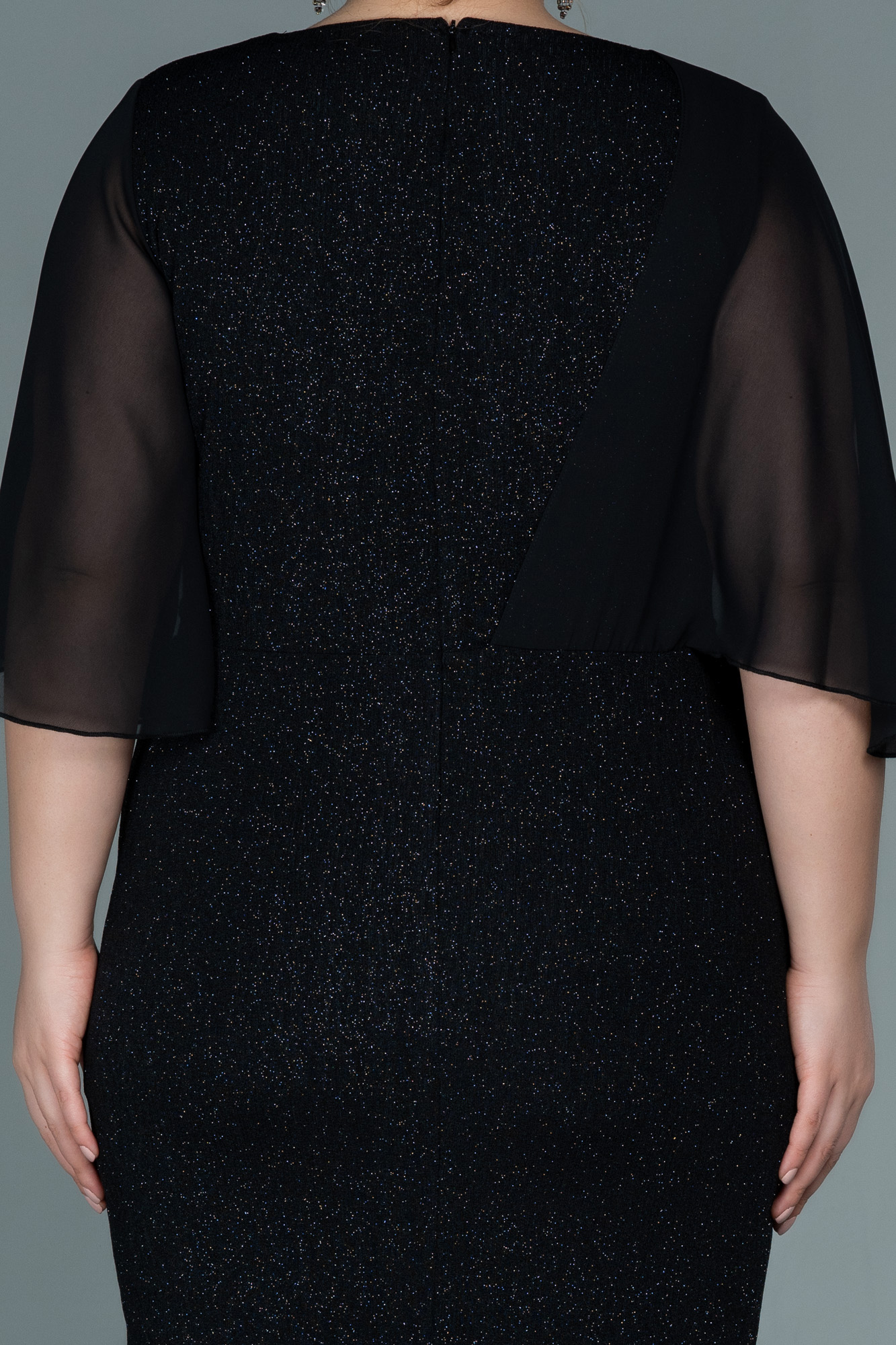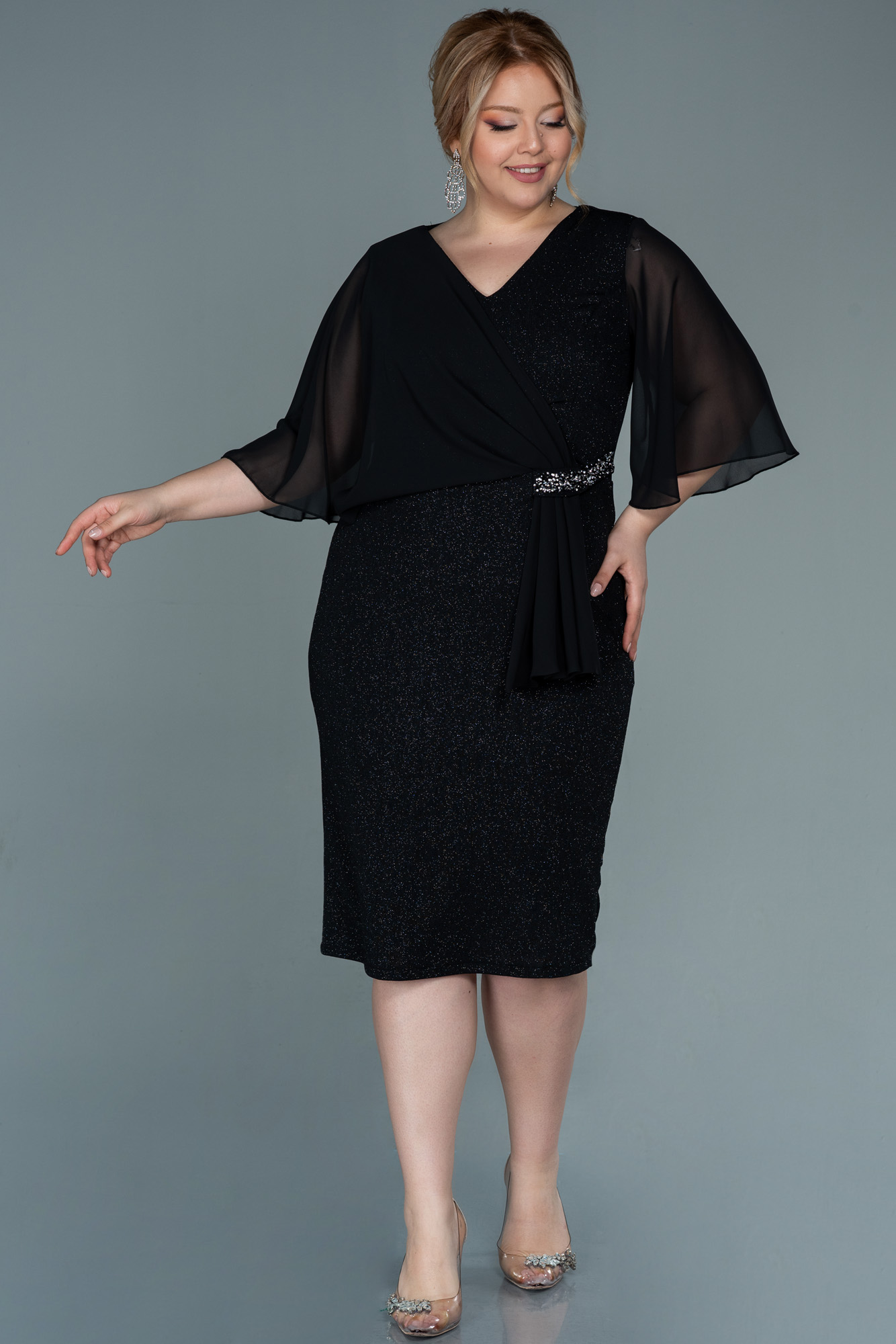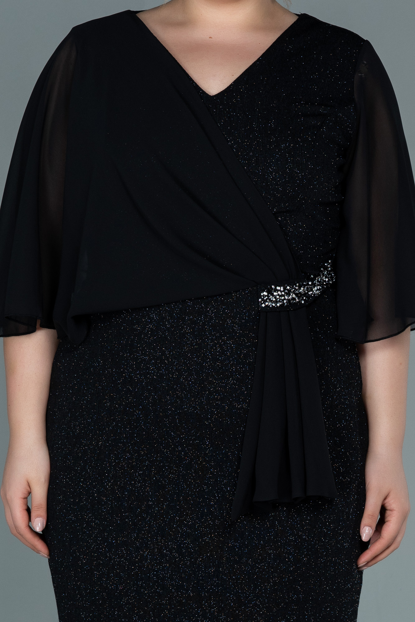 . Kısa kol simli büyük beden abiye elbise, esnek yapıya sahip simli kumaş ve şifon kumaşın mükemmel uyumu ile hazırlanmıştır. V yaka, dekoltesiz üretilen ve kol altını kapatan dökümlü kısa kol olarak çalışılmıştır. Sırt kısmından başlayarak sağ göğüs üzerine uzanan ve sol göğüs altında dikimi yapılan şifon parça modele hareketlilik kazandırmıştır. Midi büyük beden abiye elbise, göğüs altında bulunan kristal taş işleme detay ile zenginleştirilmiştir.