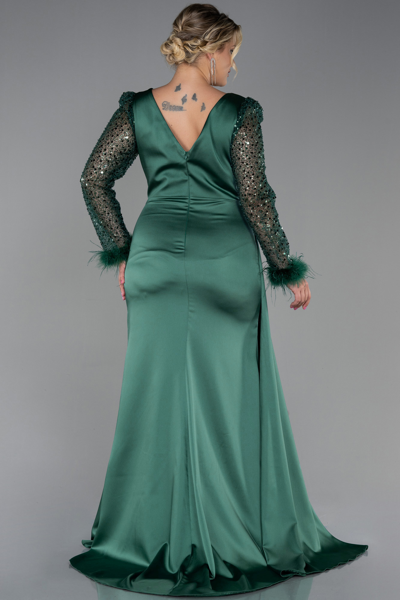 Zümrüt Yeşili Pullu Uzun Kol Saten Büyük Beden Abiye ABU3237